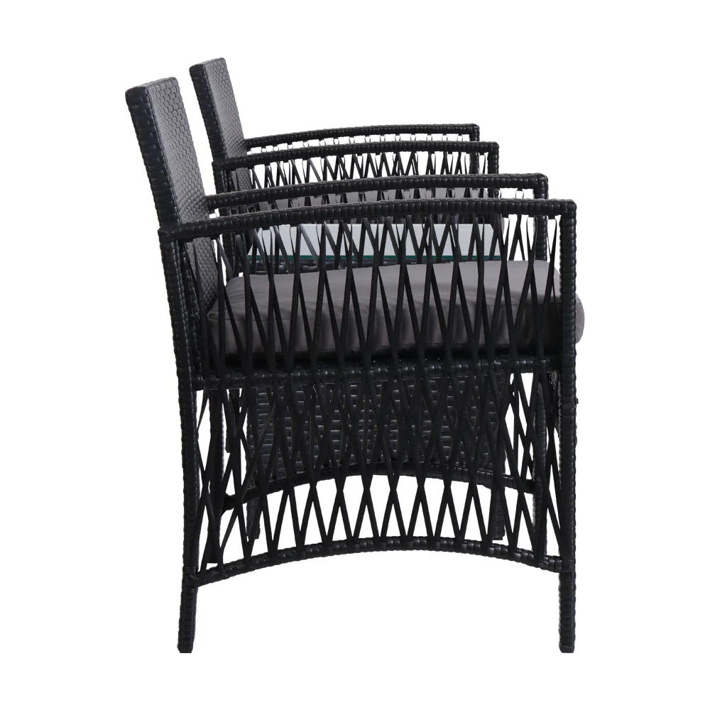 Enjoy the pleasant outdoors or have a nice chat with friends over a cuppa with our Gardeon 3-pc Outdoor Set. With its chic and trendy profile, the set comes with two chairs and a matching table. Finished in meticulously weaved UV-resistant and weather-resistant PE wicker with a strong and sturdy galvanised steel frame construction for both chairs and table, this outdoor set is designed to please as well as stand up to the weather elements. The chairs have an elegant harp-inspired design with 5cm thick high-density foam cushions to ensure comfort and style are always in place. If you spill your drink, the 5mm thick tempered glass tabletop and removable seat cushion covers make cleaning up hassle-free. With so much going for it, the outdoor set certainly deserves its coveted space in your lovely backyard, deck or patio. Or even indoors for a unique presence.