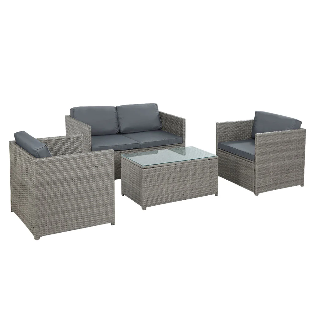 Looking to create a chic and gorgeous outdoor setting? The Gardeon 4-piece wicker outdoor set is a must purchase. It will liven up your outdoor space and help you achieve an elegant space where you can enjoy day and night and summer and winter. This 4-seater set comprises of one two-seater sofa, two single sofas, and a matching centre table. Its beautiful and versatile design makes it perfect for indoor and outdoor use. All the seat and back cushions come with thick, high-density soft padding that ensures your comfort always. Additionally, the removable cushion covers are water-resistant to suit different seasons. Furthermore, our outdoor set features a lovely wicker weave for a touch of tropical charm, and the UV-resistant PE wicker with powder-coated and weather-resistant steel frame is suitable for all-season use. The large table with thick tempered glass top and durable frame ensures strength and durability, and the secured foot pads offers ultimate stability. This table also has anti-slip suction pads that prevents the tempered glass from slipping. This wicker outdoor set will withstand the test of time. You can create a praise-worthy spot with just a little creativity that will wow your guests. Shop it for your home today.