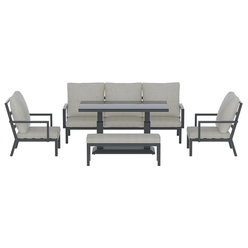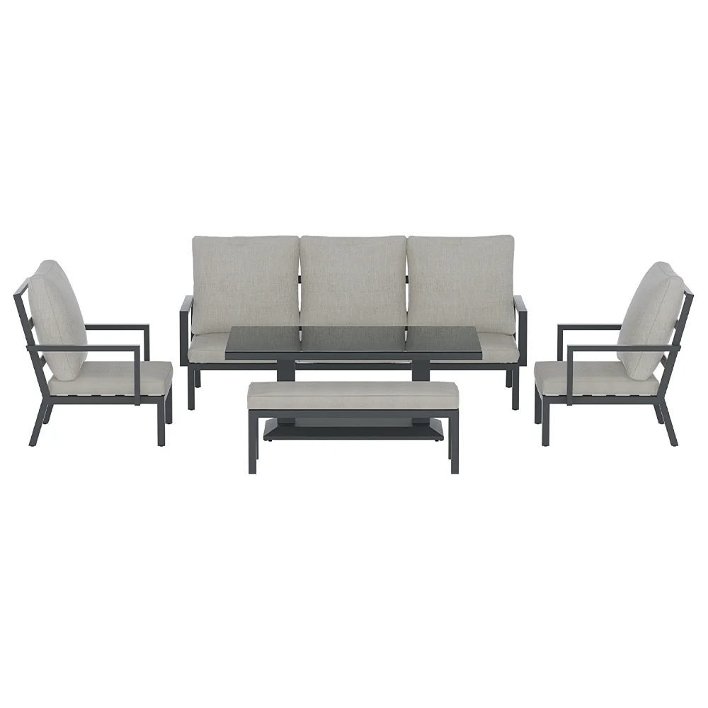 Bring friends and family together with the new 7-seater Lounge Set from Gardeon. With one 3-seater sofa, a 2-seater bench and two single sofas, there's plenty of room for everyone at the table. Made with a powder-coated aluminium frame and topped with 10cm thick cushions, the set is strong and durable-perfect for withstanding outdoor weather. The cushion covers are UV and water-resistant, and they can be removed for easy cleaning. The stylish aluminium rising table features a 5mm thick tempered glass tabletop so you can easily switch from lounging to dining. The contemporary design is perfect for backyards of all kinds, making it the ideal dining set for all your outdoor entertainment needs.