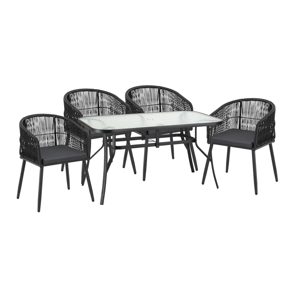 Elevate your outdoor living with the Gardeon 5 Piece Mesh Dining Set—perfect for sunny gatherings in fresh air! The rust-proof powder-coated steel frame ensures lasting durability, while the all-weather rattan resists sun, rain, and stains, keeping colors vibrant for years. The spacious tempered glass table features a convenient parasol hole for shade. Floor protectors safeguard your surfaces while providing stability on uneven ground. With its sleek, versatile design, this set transitions seamlessly from patio to indoor dining. Low-maintenance and built for comfort, the Gardeon dining set is ideal for relaxing meals with family and friends under the open sky!
