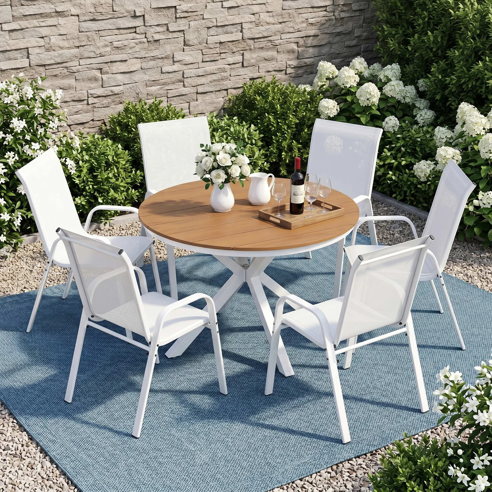 Host family and friends with the Gardeon 7 Piece Outdoor Dining Set. This spacious set seats 6 persons, featuring a durable WPC table top with a rustproof aluminium alloy frame, plus 6 stackable Textilene dining chairs with sturdy steel frames. The breathable, quick-dry Textilene fabric resists fading and weather damage. Chairs stack neatly for off-season storage.