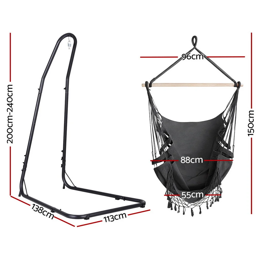 Gardeon hanging hammock chair set is a piece of excellent furniture, suitable for outdoor and indoor use. It is made from quality polyester cotton blend fabric and has a solid timber rail for strength and durability, and the powder-coated steel frame is designed to be weather and rust-resistant. Our U-shaped base hammock chair can hold up to 120kg in weight and offers stability. Plus, it's easy to install with one single attachment point for absolute safety. This versatile furniture set is suitable to be placed by the poolside, in the backyard, or in any corner of your home. Not least, this chair offers ample support to your body.