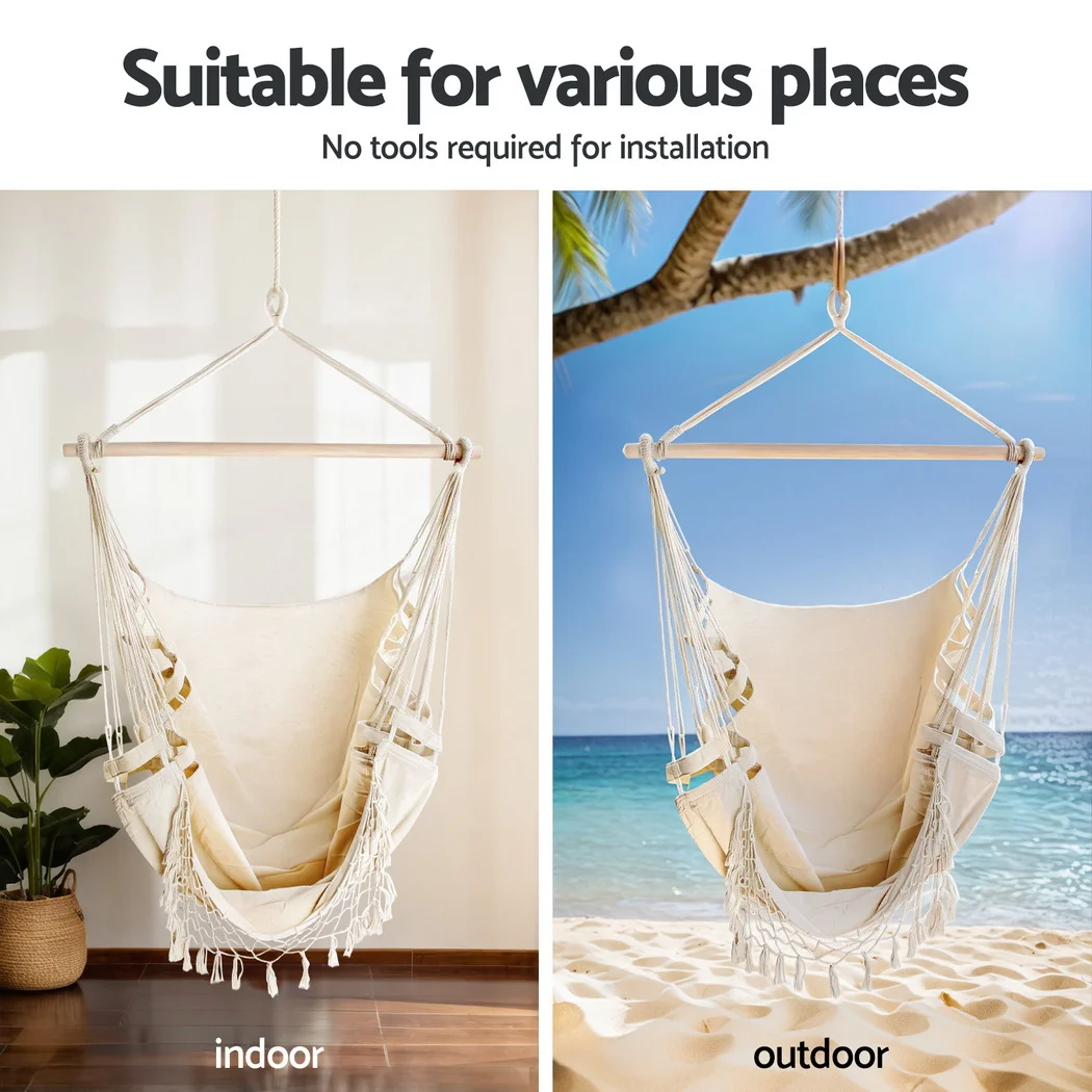 Gardeon hanging hammock chair set is a piece of excellent furniture, suitable for outdoor and indoor use. It is made from quality polyester cotton blend fabric and has a solid timber rail for strength and durability, and the powder-coated steel frame is designed to be weather and rust-resistant. Our U-shaped base hammock chair can hold up to 120kg in weight and offers stability. Plus, it's easy to install with one single attachment point for absolute safety. This versatile furniture set is suitable to be placed by the poolside, in the backyard, or in any corner of your home. Not least, this chair offers ample support to your body.