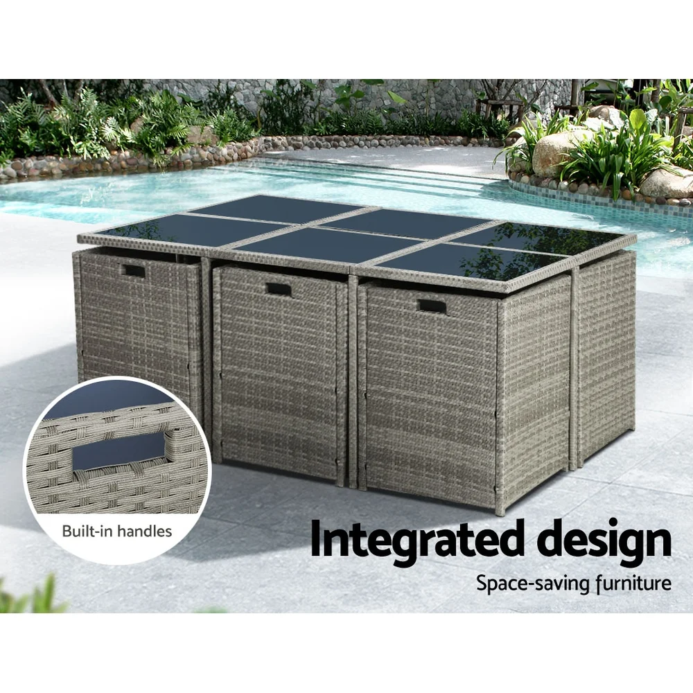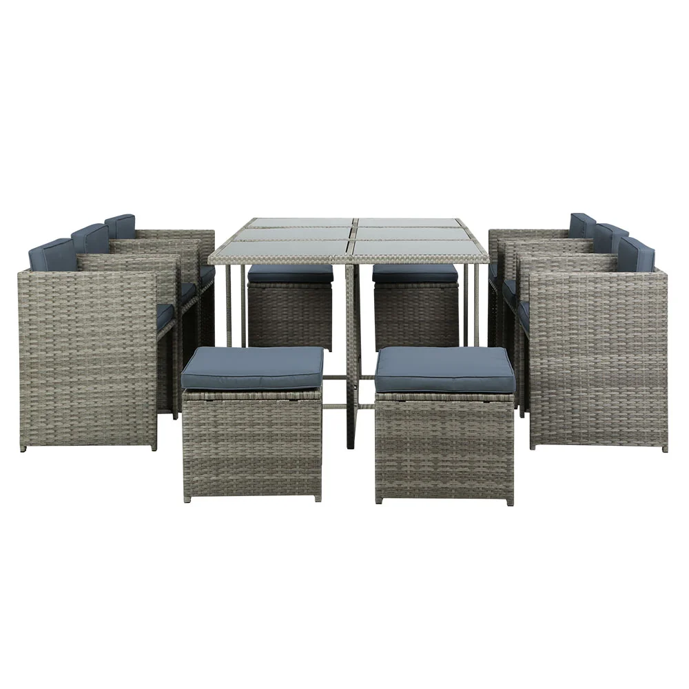 Looking to create a chic and gorgeous outdoor dining setting? The Gardeon 10-seater wicker outdoor dining set is a must purchase. It will liven up your outdoor space and help you achieve an elegant space where you can enjoy day and night and summer and winter. This 11-piece set comprises of six chairs, four ottomans, and a large table. It boasts an integrated design that helps save space. The ottomans can be pushed under the chairs when not needed. All the seat and back cushions come with thick, high-density soft padding that ensures your comfort always. Additionally, the removable cushion covers are water-resistant to suit different seasons. Furthermore, our outdoor set features a lovely wicker weave for a touch of tropical charm, and the UV-resistant PE wicker with weather-resistant steel frame is suitable for all-season use. The large table with thick tempered glass top, durable frame, and stable cross construction ensures strength, durability, and stability. This set also comes with a bonus water-resistant storage cover that offer protection from all seasons. Our wicker outdoor dining set will withstand the test of time. You can create a praise-worthy spot with just a little creativity that will wow your guests. Shop it for your home today.
