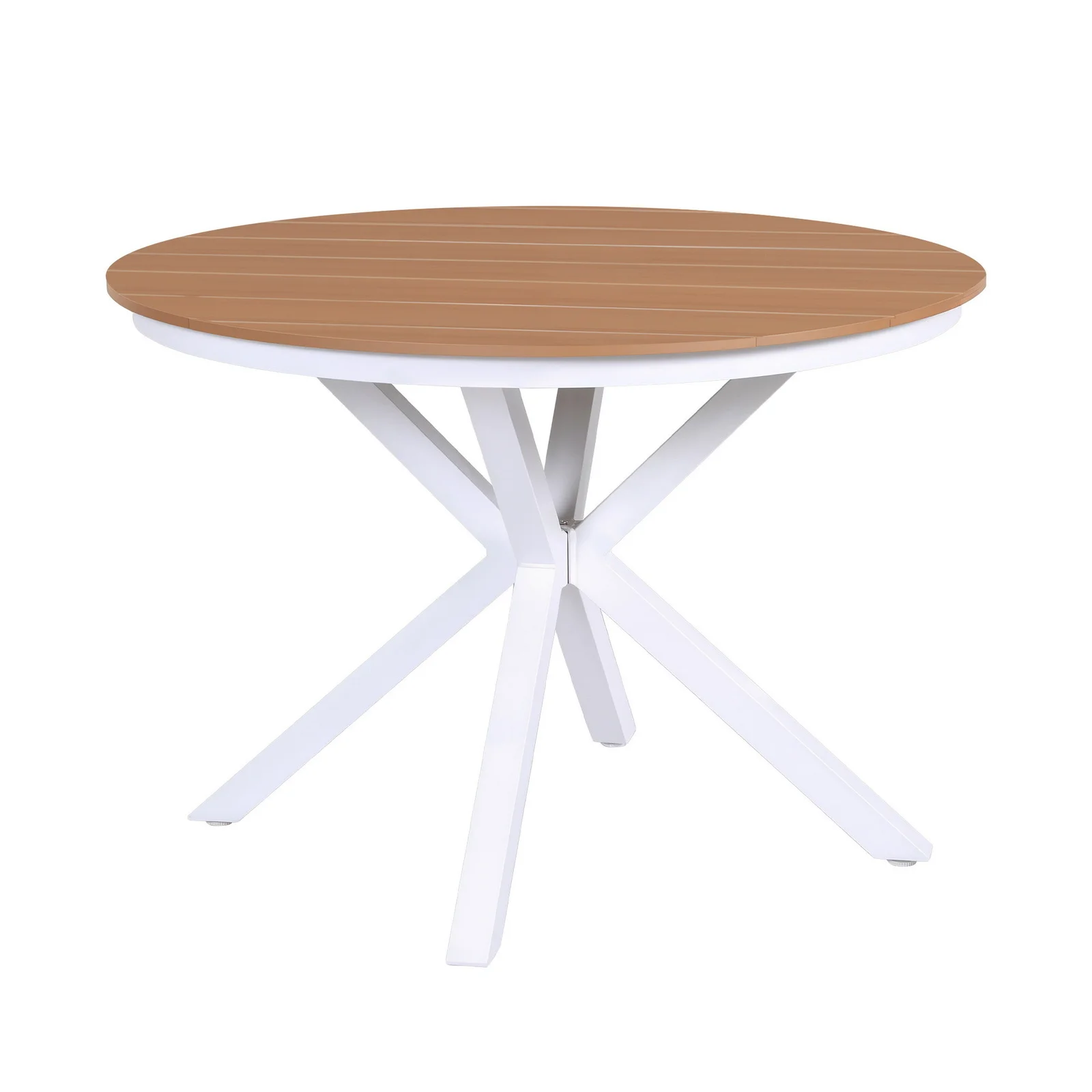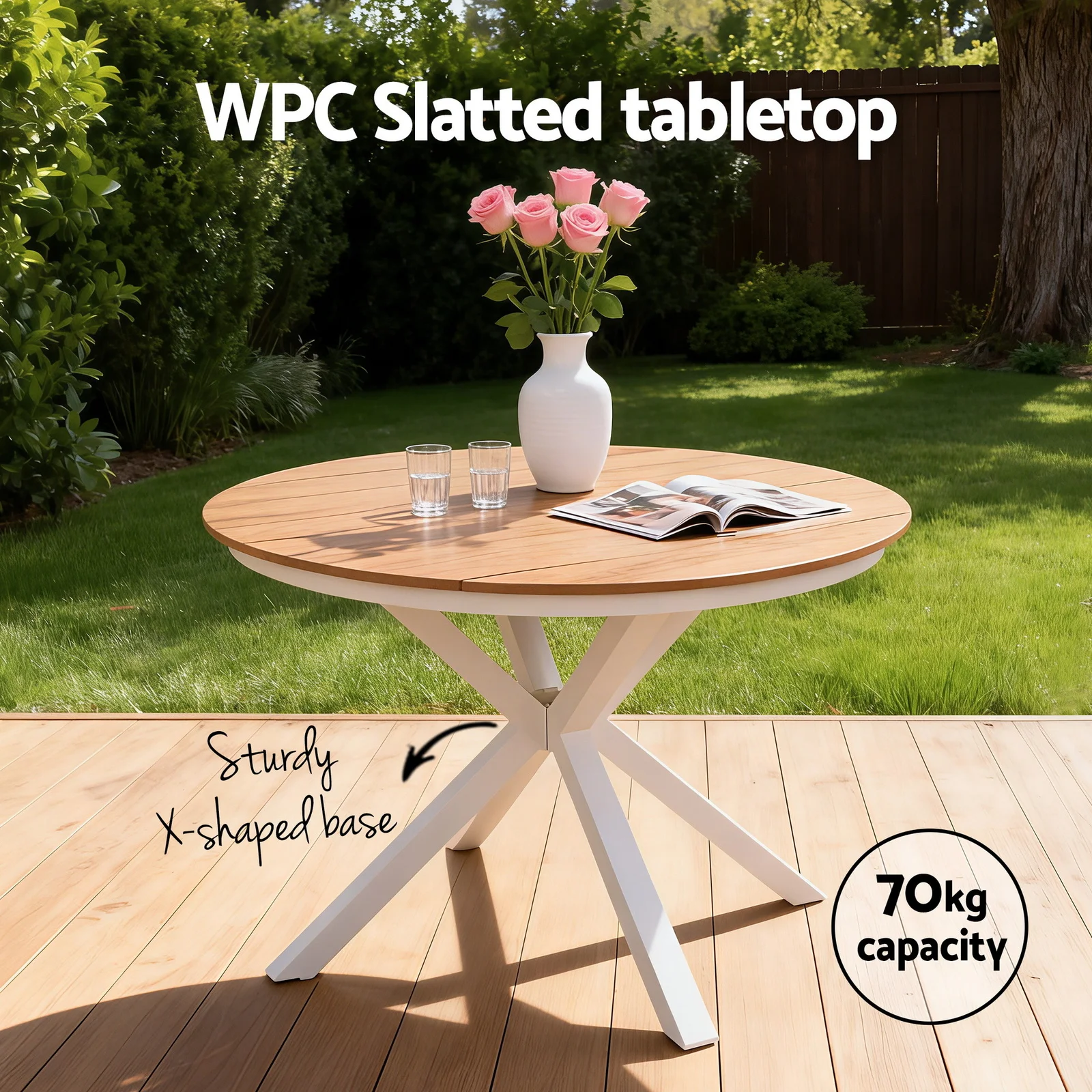 Elevate every gathering with Gardeon's versatile round dining table, designed to seamlessly blend indoor comfort with outdoor resilience. Anchored by a robust powder-coated aluminum X-base, this table pairs striking modern structure with a durable WPC (Wood-Plastic Composite) tabletop that offers the warm, natural aesthetic of teak without the intensive upkeep. The weather-resistant construction ensures lasting beauty in any environment, from garden brunches to formal dinners. Occasional cleaning with mild soap and water keeps your table looking pristine year after year. Experience enduring design, effortless maintenance, and timeless appeal—all in one graceful piece.