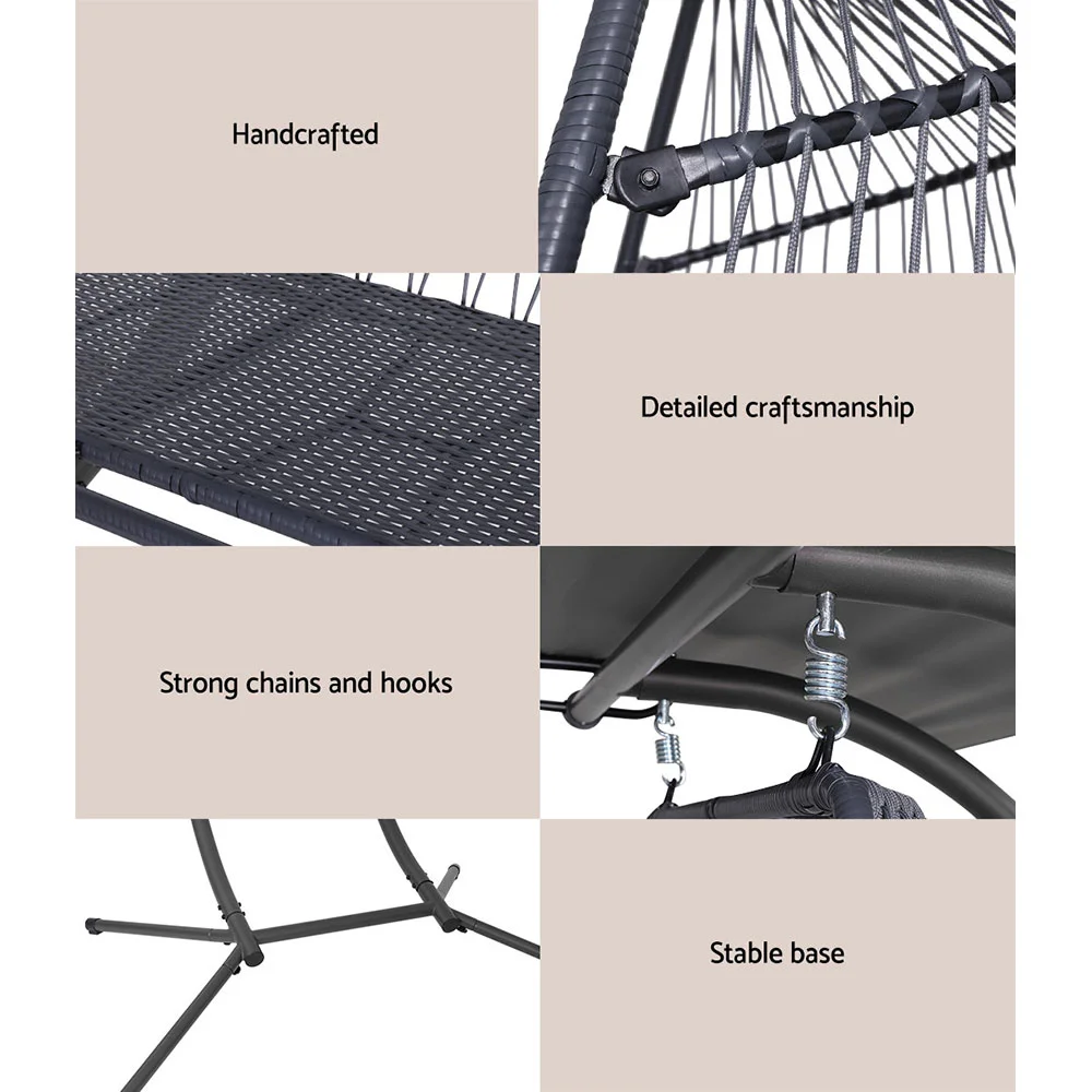 Otherwise known as the hanging egg chair, our Gardeon Double Hanging Pod Chair is the epitome of ultimate relaxation with a cool and exotic vibe. With its 100% hand-woven UV-resistant resin wicker, the pod chair is beautifully handcrafted and well hung on a steel pole for stability and strength. Plus, the adjustable canopy can be angled to suit your shading or completely removed for a wondrous tan. The powder-coated steel frame finish ensures that corrosion will never be an issue while the soft, fully-padded cushioned seat offers plush comfort for day dreamers and leisure seekers alike. Best of all, it seats two and has ample space for relaxation with a weight capacity of up to 200kg. Sit back with your loved one and turn an ordinary day into an extraordinary one. Hang cool people!