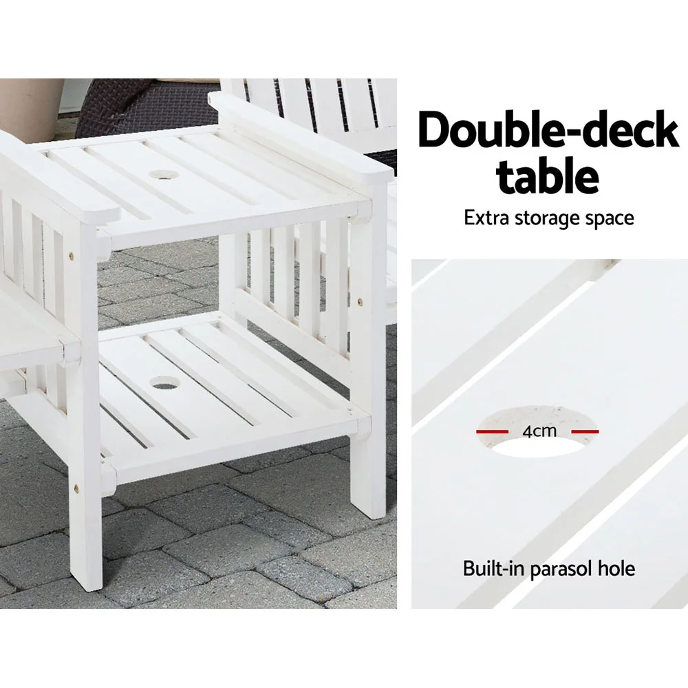 With its modern rustic vibes, the 2-Seater Garden bench is the perfect tete-a-tete set to spend the day with your bestie. Its beautiful natural fir wood construction is meticulously handcrafted to bring out the wood's finest qualities. The finishing is impeccable as is its classic design that will certainly stand the test of time and trends. With two integrated armchairs and an adjoining table, the ensemble features a strong inherent structure with ample weight capacities for armchairs and table. Better still, the table features a double-deck design for extra storage space and a built-in parasol hole to fit an outdoor umbrella if required. Not least, the bench is designed to ensure that your comfort is always forefront in its form and function.