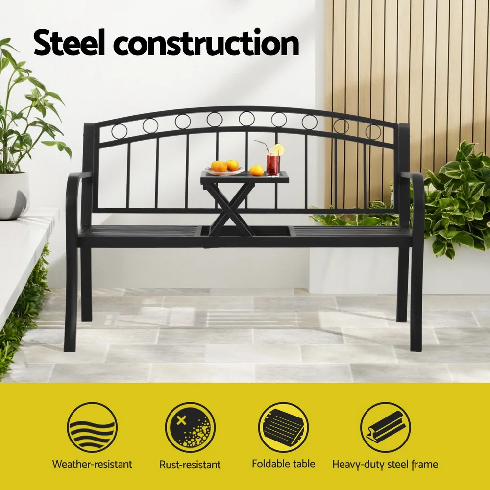 Experience the perfect blend of style and functionality with the Gardeon Multifunctional Garden Bench. This modern rustic outdoor seating solution boasts strong black steel construction, featuring an impeccable weather-resistant finish that ensures durability in various outdoor conditions. The bench's smooth, easy-to-clean surface and curved edges not only enhance its aesthetic appeal but also provide comfort for up to three people. The design includes a hidden center table that can be raised, transforming the three-seater into a cozy two-seater with a convenient surface for afternoon tea, drinks, or snacks.