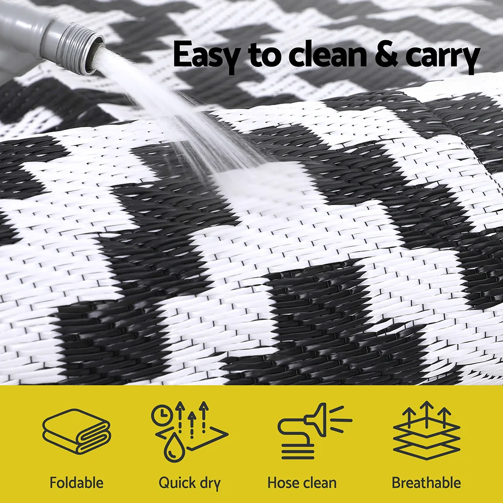 Upgrade your outdoor space with Gardeon outdoor rug, featuring two stylish sides for instant patio refresh. Crafted from premium plastic straws with UV coating and heat-treated edges, it resists fading, water, and wear while staying soft underfoot. Lightweight yet durable, it's perfect for decks, pools, camping, or beach. Easy to clean (just hose off!) and available in multiple sizes. Ideal for gardens, beaches, RVs, and more, this rug blends practicality with boho charm for endless outdoor adventures.
