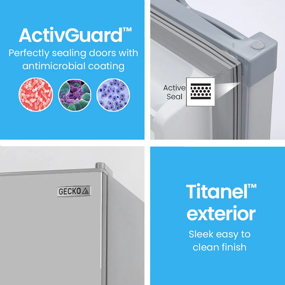 The Gecko Camping Fridge Freezer is designed to perform in harsh Australian conditions with quality compressor technology and thick insulation for fast cooling and operation in ambient temperatures of up to 38 degrees! The Gecko range features ActivSealTM technology, which consists of perfectly sealing doors with an anti-microbial coating to inhibit the growth of germs. The Gecko has flush, recessed handles, a great feature for confined spaces. All this is wrapped in a sleek TitanelTM metal finish, ensuring it will look right at home, anywhere!