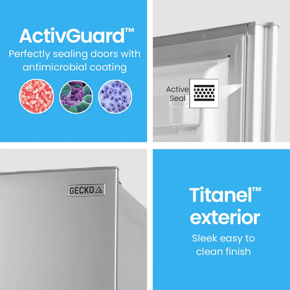 The Gecko Camping Fridge Freezer is designed to perform in harsh Australian conditions with quality compressor technology and thick insulation for fast cooling and operation in ambient temperatures of up to 38 degrees! The Gecko range features ActivSealTM technology which consists of perfectly sealing doors with an anti-microbial coating to inhibit the growth of germs. The Gecko also has flush recessed handlesa great feature for confined spaces. All this is wrapped in a sleek TitanelTM metal finish, ensuring it will look right at home, anywhere!