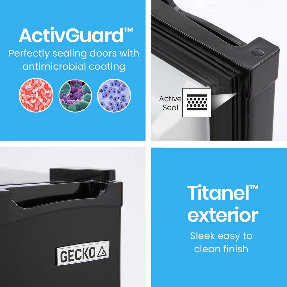 The Gecko Camping Fridge Freezer is designed to perform in harsh Australian conditions with quality compressor technology and thick insulation for fast cooling and operation in ambient temperatures of up to 38 degrees! The Gecko range features ActivSealTM technology which consists of perfectly sealing doors with an anti-microbial coating to inhibit the growth of germs. The Gecko also has flush recessed handlesa great feature for confined spaces. All this is wrapped in a sleek TitanelTM metal finish, ensuring it will look right at home, anywhere!