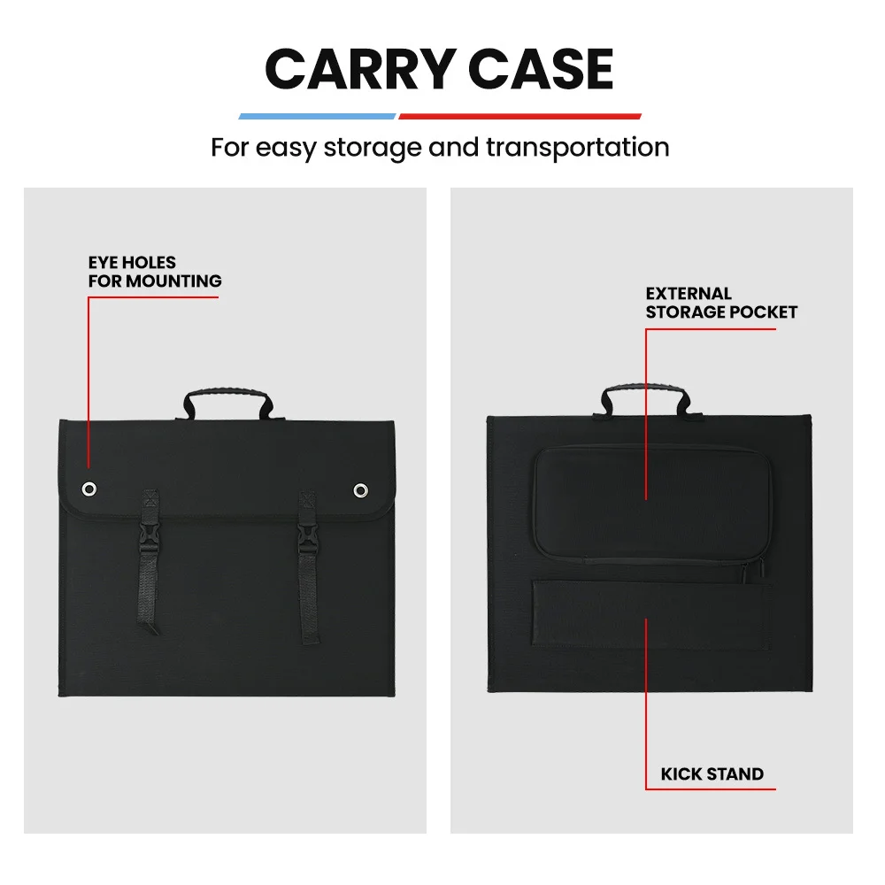 Two adjustable kickstands quickly and conveniently fold out to adjust the angle of your panels to the sun for optimal energy absorption, and can capture 25-30% more power throughout the day. Simply fold out and place your solar panels next to your tent or trailer for a convenient power source whenever you need it.