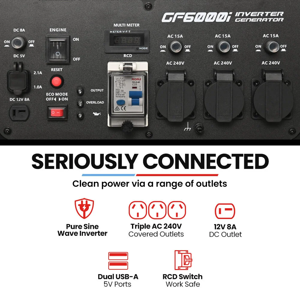 Flexibility is built into its design. You’ll find three 15A Australian sockets, a 12V DC outlet, and dual USB ports, giving you the ability to charge and power everything from tools to tech. Safety is a priority with overload, low-oil, and over-temperature protections, plus an RCD safety switch for added peace of mind. The brushless copper alternator ensures durability, while forced air cooling keeps everything running smoothly.