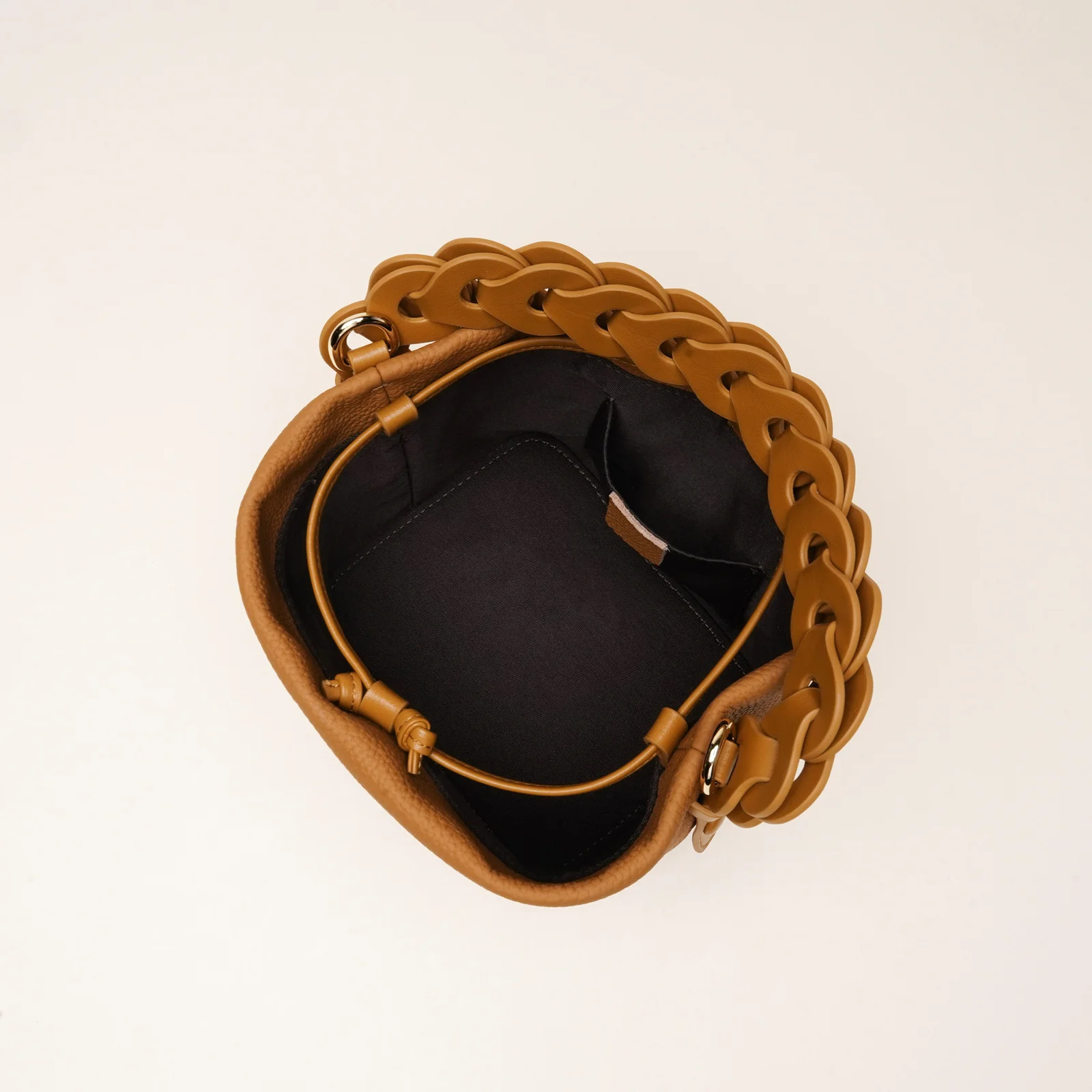 Make a chic statement with this exquisite Mini Bucket Bag, beautifully crafted from soft, pebbled genuine leather. This versatile bag combines the timeless appeal of a bucket bag with modern, artistic details. It features a unique, intricately braided top handle that adds a touch of sophisticated craftsmanship. For versatile styling, it also includes a detachable and adjustable long shoulder strap, allowing it to be worn as a crossbody or shoulder bag. The bag secures with a classic drawstring closure, complemented by a magnetic snap button for added security. Inside, the lined interior includes a small slip pocket to keep your essentials organized. Its compact size is perfect for carrying your phone, wallet, keys, and makeup.