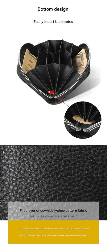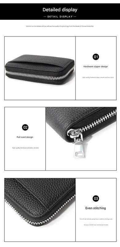 Secure your essentials in style with our Genuine Leather RFID Blocking Wallet. This compact yet spacious wallet is crafted from soft, top-layer cowhide with a sophisticated lychee grain texture and is designed to protect your personal information from electronic theft. The interior features an accordion-style design with multiple compartments for cards, cash, coins, and IDs, allowing for easy organization and access. The wallet's through-bottom design can accommodate banknotes without folding. A high-quality metal zipper ensures your belongings are kept secure, while the uniform and durable stitching guarantees longevity. This wallet is the perfect blend of fashion, function, and security for your daily needs.