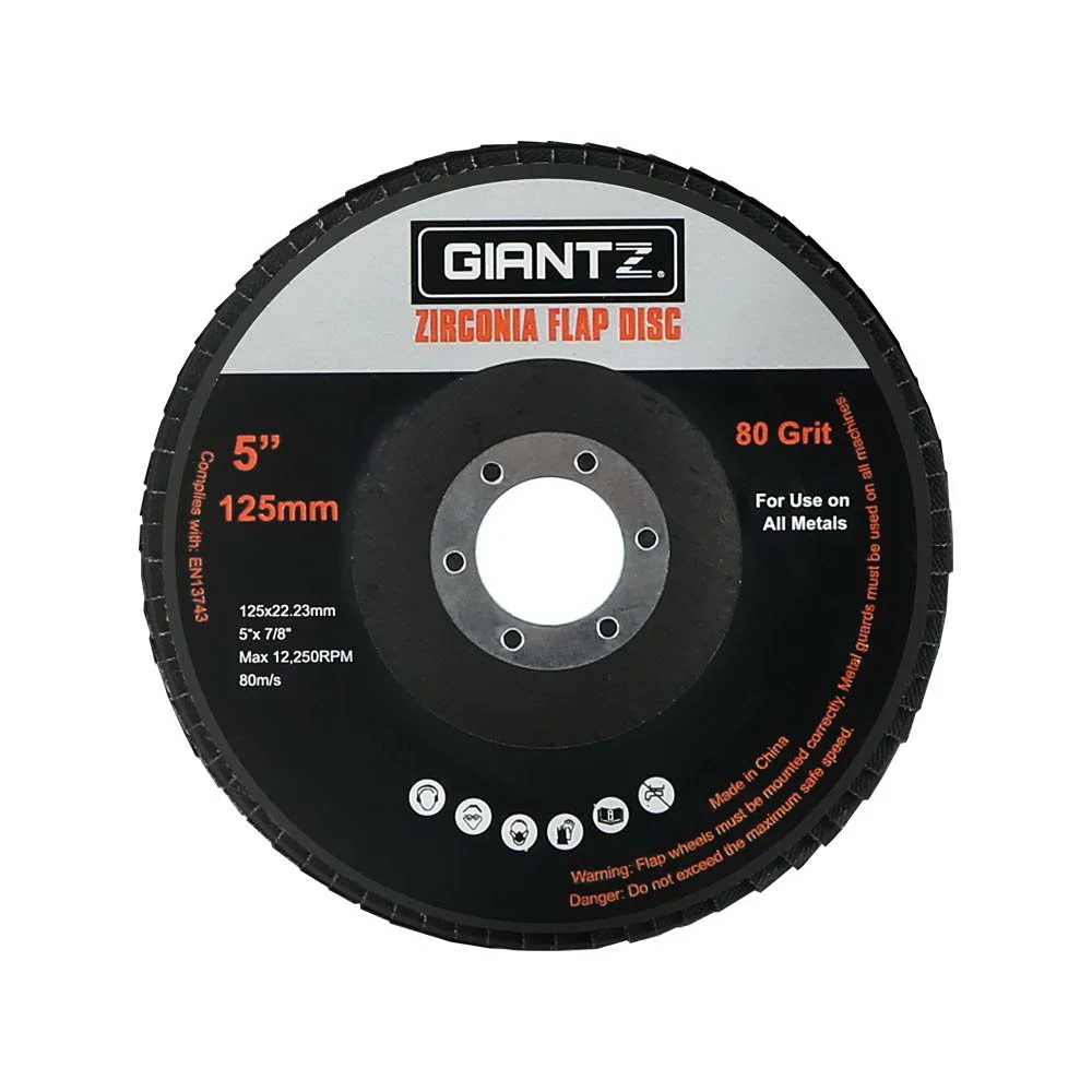 Quality DIY builds require quality tools, and you can't go wrong with Giantz 5" Flap Discs. Made from high-quality zirconium oxide, these discs are ultra-tough and ideal for all your cutting needs. Featuring a fibre netting backing, the discs are vibration resistant and have good heat dissipation, while the stainless-steel centre ring allows for safer installation and clamp strength. With extremely low vibrations and a max speed of 12500rpm, this disc makes a clean and stable cut every time. Suitable for wood and a variety of metals including stainless steel, aluminium and cast iron. Specially formulated for angle grinders and at EN-certified quality, these Giantz Flap Discs will last the life of your project and beyond. Comes in a pack of 100.