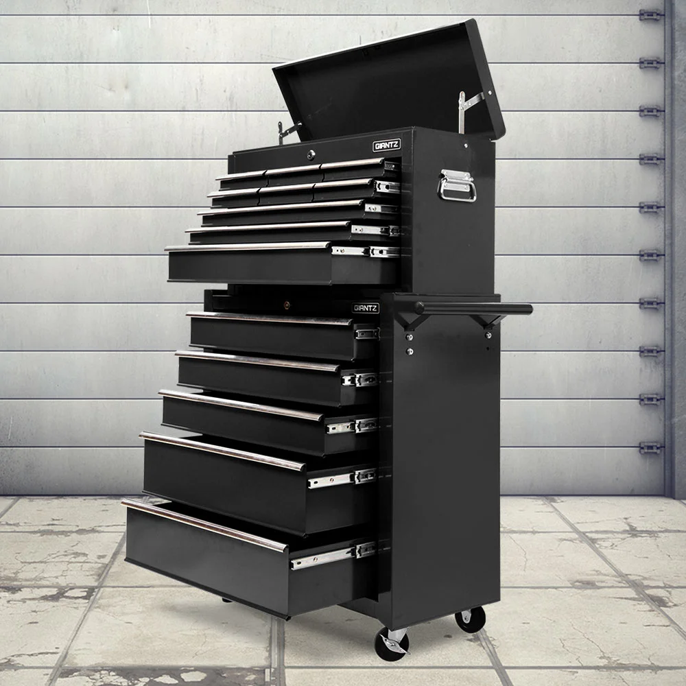 This robust, multi-drawer Giantz Tool Trolley is an essential for any workshop. Crafted from durable steel, it features smooth ball-bearing slides for easy access and a secure lock system for safety. Its spacious design includes varying drawer sizes to accommodate tools of all shapes, complete with non-slip liners. The chest is also mounted on omni-directional castors with locakble front wheels, ensuring a smooth maneuverability and stable positioning. Sleek and functional, it's perfect for organizing and protecting your valuable tools.