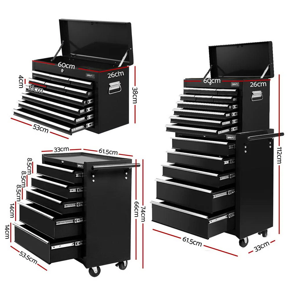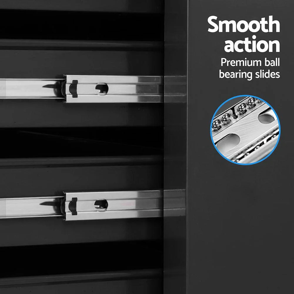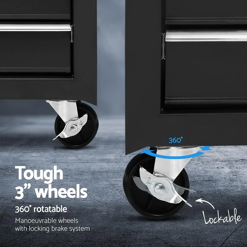 This robust, multi-drawer Giantz Tool Trolley is an essential for any workshop. Crafted from durable steel, it features smooth ball-bearing slides for easy access and a secure lock system for safety. Its spacious design includes varying drawer sizes to accommodate tools of all shapes, complete with non-slip liners. The chest is also mounted on omni-directional castors with locakble front wheels, ensuring a smooth maneuverability and stable positioning. Sleek and functional, it's perfect for organizing and protecting your valuable tools.
