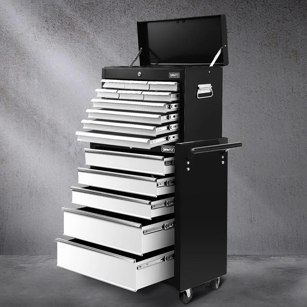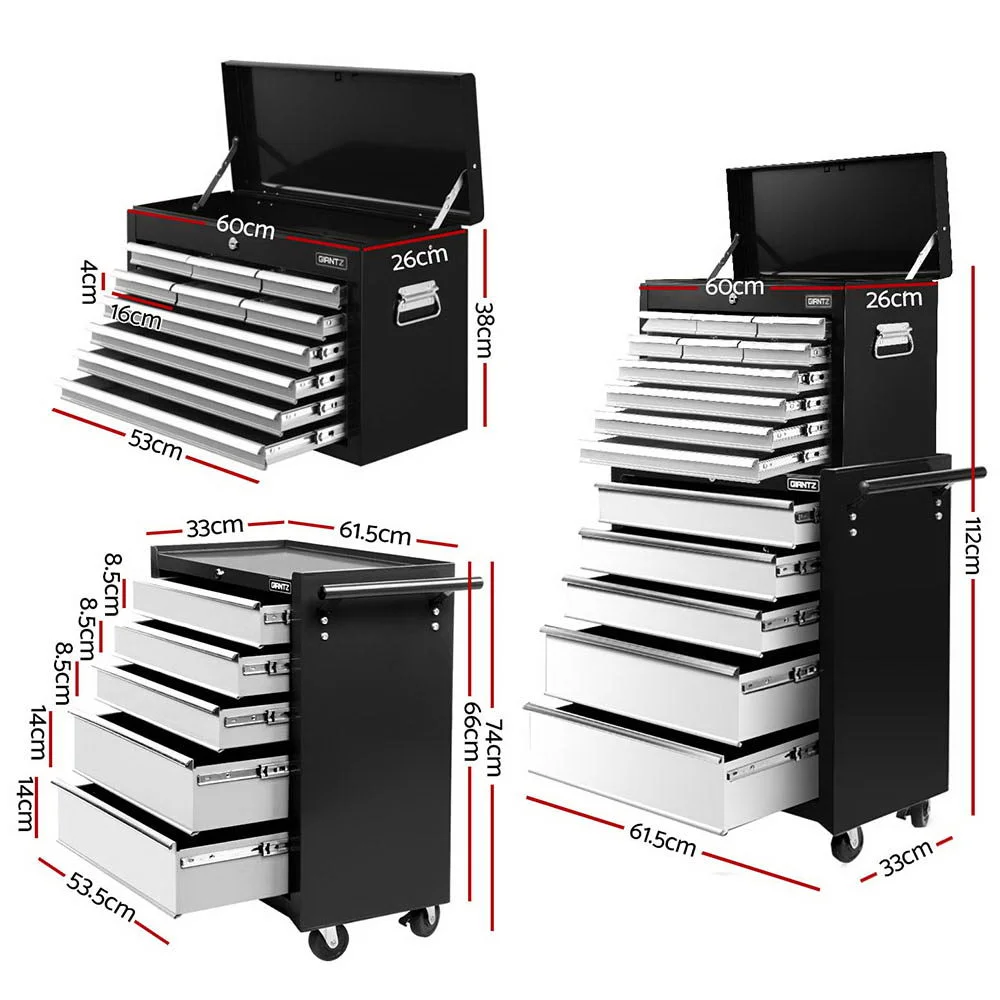 This robust, multi-drawer Giantz Tool Trolley is an essential for any workshop. Crafted from durable steel, it features smooth ball-bearing slides for easy access and a secure lock system for safety. Its spacious design includes varying drawer sizes to accommodate tools of all shapes, complete with non-slip liners. The chest is also mounted on omni-directional castors with locakble front wheels, ensuring a smooth maneuverability and stable positioning. Sleek and functional, it's perfect for organizing and protecting your valuable tools.