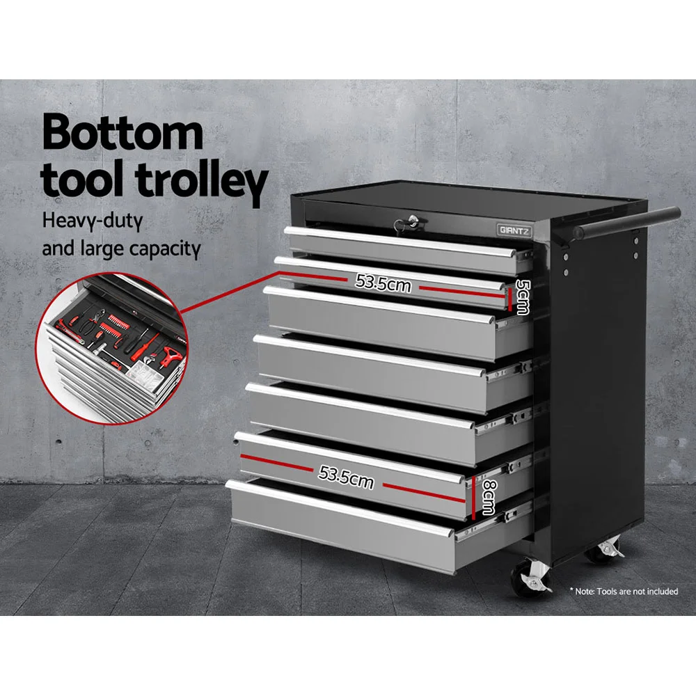 This robust, multi-drawer Giantz Tool Trolley is an essential for any workshop. Crafted from durable steel, it features smooth ball-bearing slides for easy access and a secure lock system for safety. Its spacious design includes varying drawer sizes to accommodate tools of all shapes, complete with non-slip liners. The chest is also mounted on omni-directional castors with locakble front wheels, ensuring a smooth maneuverability and stable positioning. Sleek and functional, it's perfect for organizing and protecting your valuable tools.
