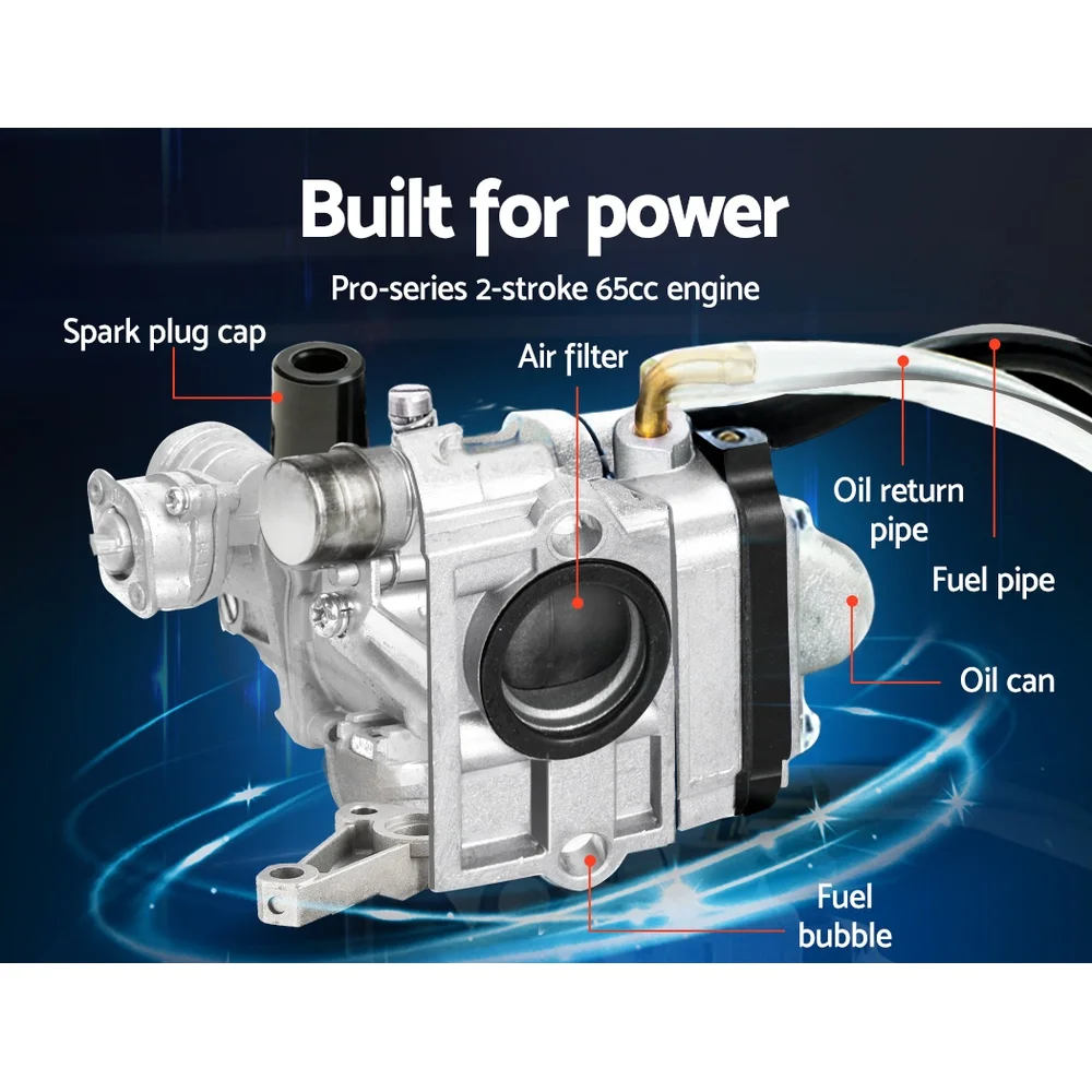 Get the earth moving quick and easy with the GIANTZ Hand-held Tiller. Featuring a 65cc 10,000rpm 2-stroke petrol motor, the tiller churns out soil deep and wide with its 16 teeth of hardened steel tines. The four blades allows you to till an extra-wide swath of 300mm and up to 150mm in depth. In other words, you only need one pass with the tiller to pulverise the soil and get the right seedbed for your favourite crops. Operating the tiller is just as easy with its pull-start improved engine, steady handle and quick-release hand throttle control and all-terrain rubber tyres to transform back-breaking tilling work into a ground-breaking stroll. And when the tilling is done, just fold away the tiller and store with the rest of your tools. Ideal for the home gardener or small-scale commercial grower.