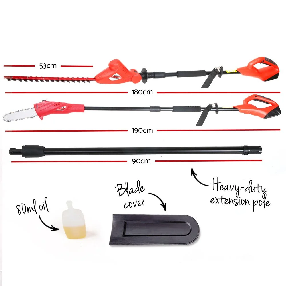 Operation-wise, the Chainsaw has an auto oil-lubrication function that prevents the Chainsaw from running dry. You can easily monitor this through the oil level window located at the side of the unit. And if you do need to tighten the chain from time to time, an allen key is provided for easy adjustments. With the Trimmer, you can get five different angle settings to help you manipulate around corners and odd angles with ease. Your job is made easier too with a bonus 0.9m extension pole that can extend up to 2.7m, giving you an average reach of 3.5m. Nothing is too hard to reach with our cutting wonders.