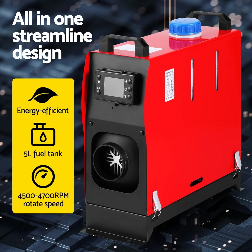 For fast and efficient heating on the go, the Giantz 5KW Portable Diesel Air Heater is a fantastic climate control solution that suits a wide variety of vehicles including caravans, motorhomes, trucks, camping trailers, buses, boats, machinery and more. With its low-noise operation, you can enjoy a peaceful environment while staying warm. The heater features a large 5L fuel tank, ensuring long-lasting heating without the need for frequent refills. Designed with energy-saving technology, this heater boasts low fuel consumption while providing a high heat output. The LCD monitor control allows for easy temperature adjustments, while the 30-metre long-distance remote control offers convenient heating from a distance. Compact and easy to install, this versatile heater will help you stay cosy and comfortable wherever you go.