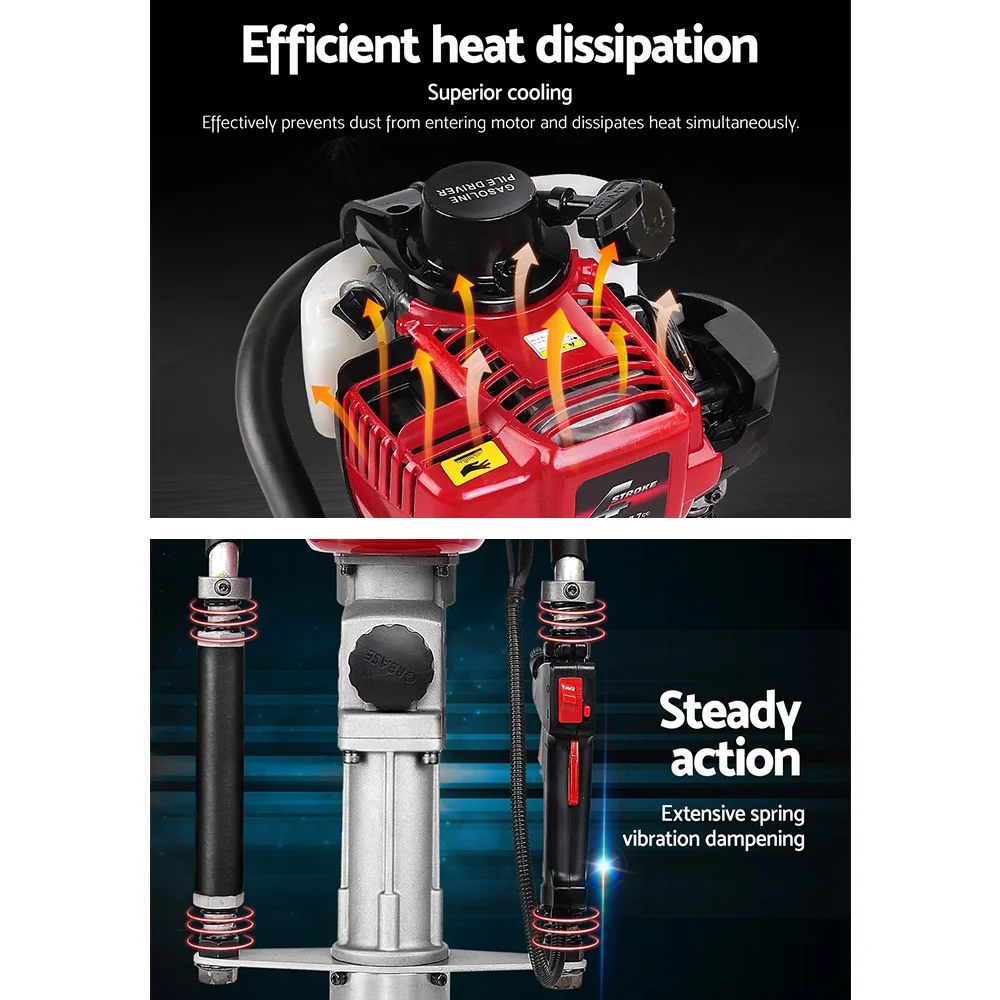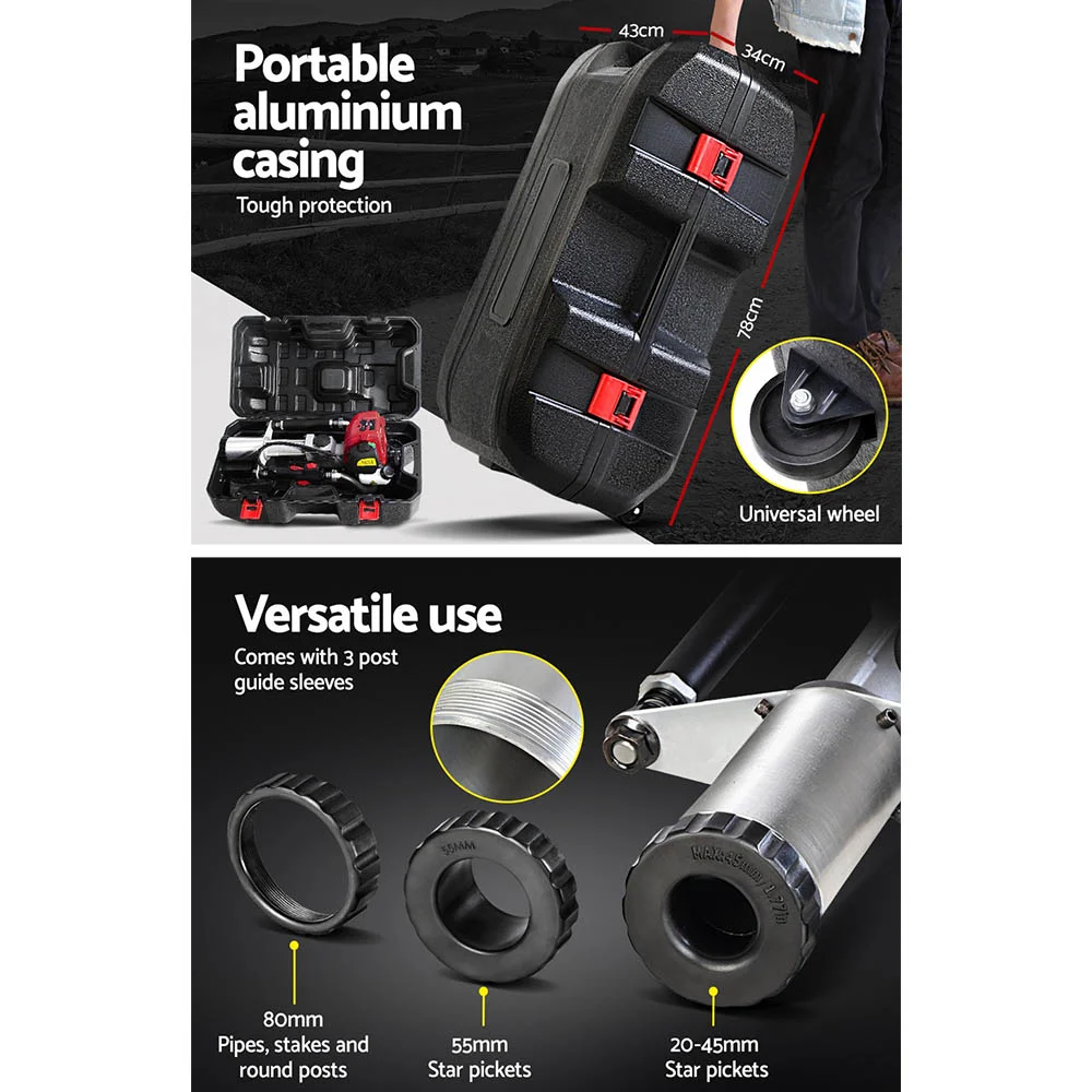 The Giantz Petrol Post Driver is as tough as it looks. No drive is too difficult for exceptional post driver. Powered by a class-leading petrol motor, the driver will hammer down stakes, pegs and posts of up to 80mm in diameter firmly into the ground. Featuring a hardened hammering pin with absolute power and unrivalled impact frequency, the post driver gets the job done in minutes with minimum hassle. Better still, the driver is designed for superb handling with soft rubber grip handles and vibration absorbing springs to minimise fatigue. It features interlocking controls with throttle lock, kill switch and throttle adjustor, all close at hand.