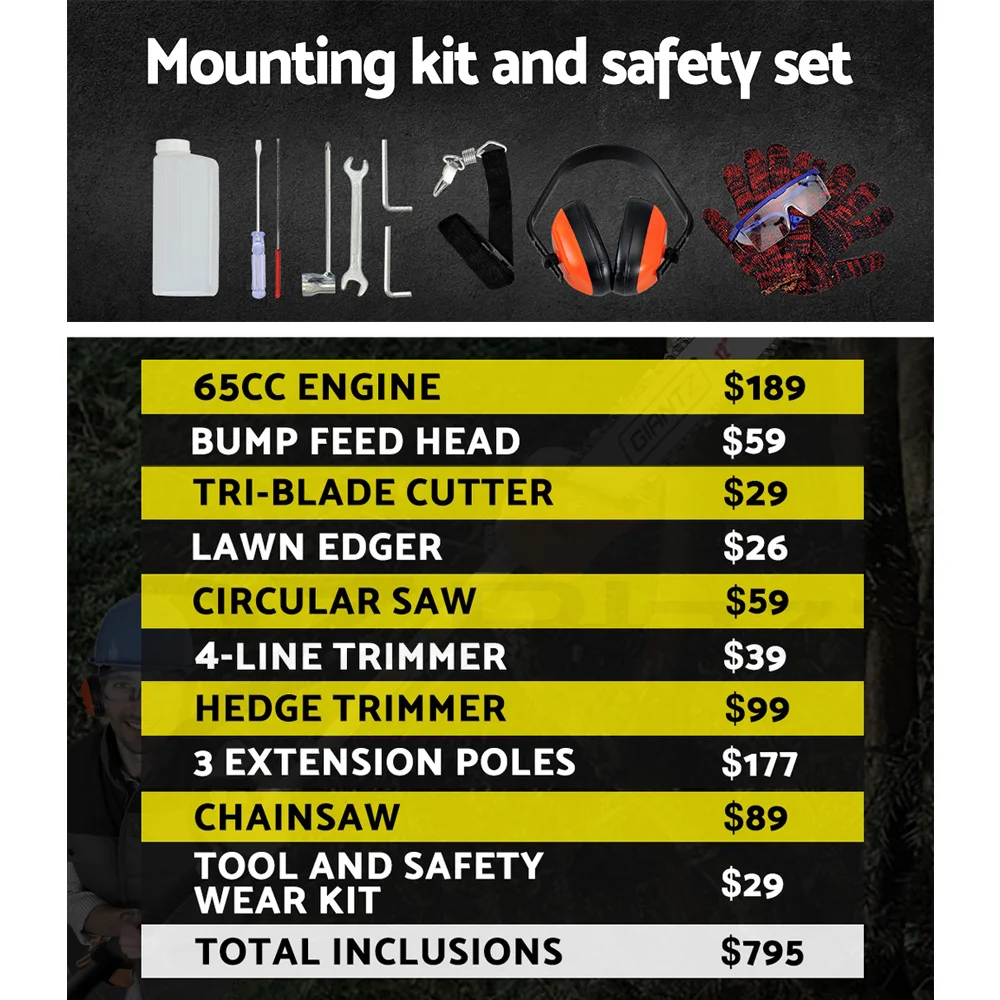 The GIANTZ 9-in-1 Pro-series Chainsaw is the answer for people who are looking for doing serious cutting and bring it to the next level. Featuring a powerful 52cc 2-stroke engine with an E-start recoil pull system, the chainsaw trims and cuts every gardening challenge in its path with minimum hassle. Efficient and lightweight in design and equipped with a comfortable D-handle, the chainsaw allows quick-connect coupling for easy change of attachments. In fact, up to seven attachments for every conceivable cutting job. Better still, the chainsaw also comes with three extra thick alloy extension poles which allows you to reach up to 6.3m for those hard-to-get branches. Not least, the cutting equipment also features fine quality construction and cutting-edge technology to ensure the chainsaw remains reliable, durable and sharp consistently.