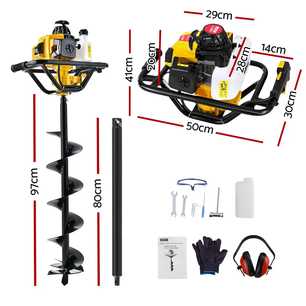 Introducing our robust Giantz Post Hole Digger, crafted from heavy-duty steel for durability, featuring a simple recoil start, vertical gearbox for enhanced performance, anti-vibration handle for comfort, easy-to-fill fuel tank, high torque output, and reliable efficiency.