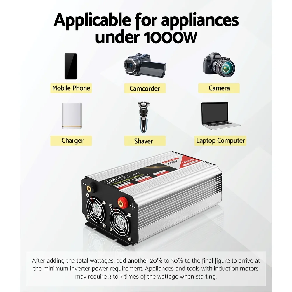 Compatible with any 12V battery, the Wave Inverter uses reliable Japanese engineering capacitance and incorporates the latest IGBT inverter technology for a remarkable 90% high efficiency rate. It has a continuous output of 1000W and peaking at 2000W. It also has a convenient USB output and dual 240V sockets. Not least, the Inverter meets Australian specifications and has overloading, over-voltage and overheating protection.