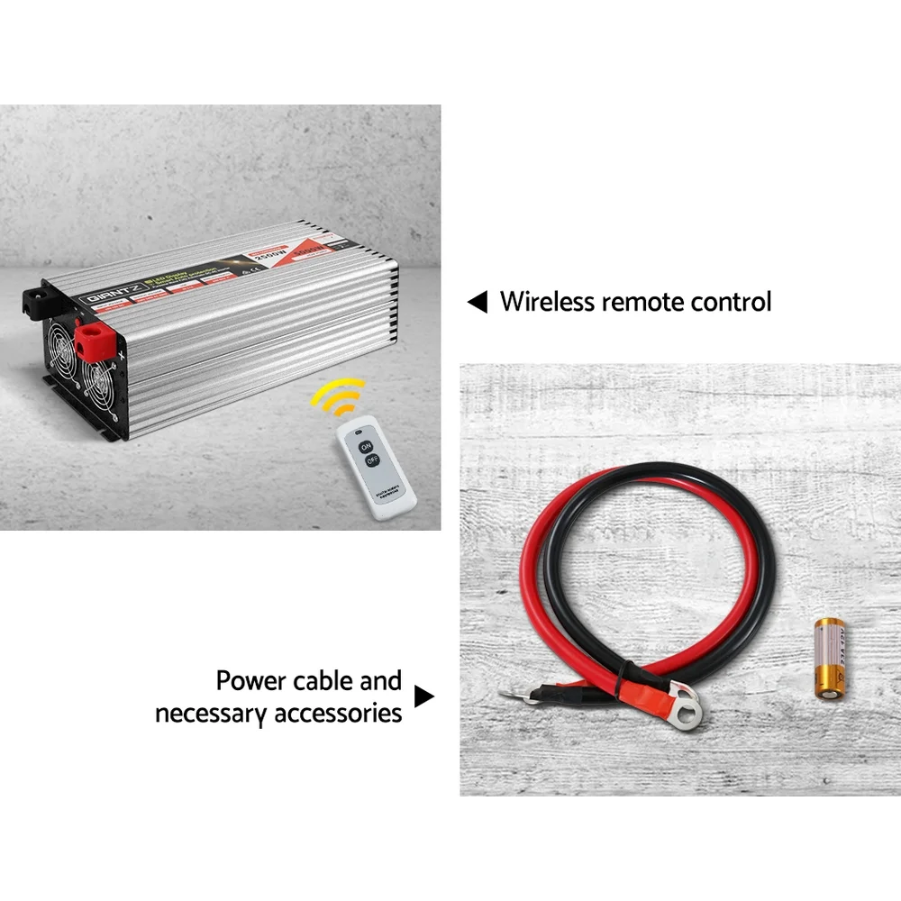 If you are looking for ways to power up your devices, hook up with the Giantz Pure Sine Wave Inverter. A Pure Sine Wave Inverter produces a clean current without any signal interference, making it perfect for running sensitive equipment such as computers, phones and TVs. Simply hook it up to your car, 4WD, caravan or boat battery and run your 220-240V appliances just like at home. You can use it manually or wirelessly with the included wireless remote control. Compatible with any 12V battery, the Pure Sine Wave Inverter uses reliable Japanese engineering and incorporates the latest IGBT inverter technology for a remarkable 90% high efficiency rate. It has a continuous output of 2500W with a peak output at 5000W. It has a convenient USB output and dual 240V sockets. Not least, the inverter meets Australian specifications and has a low battery alarm, safety shutdown, short circuit protection and other features to prevent overheating, over-voltage and overloading. With the Giantz Pure Sine Wave Inverter, you can be assured of constant clean power within reach anywhere, anytime. Get yours today.