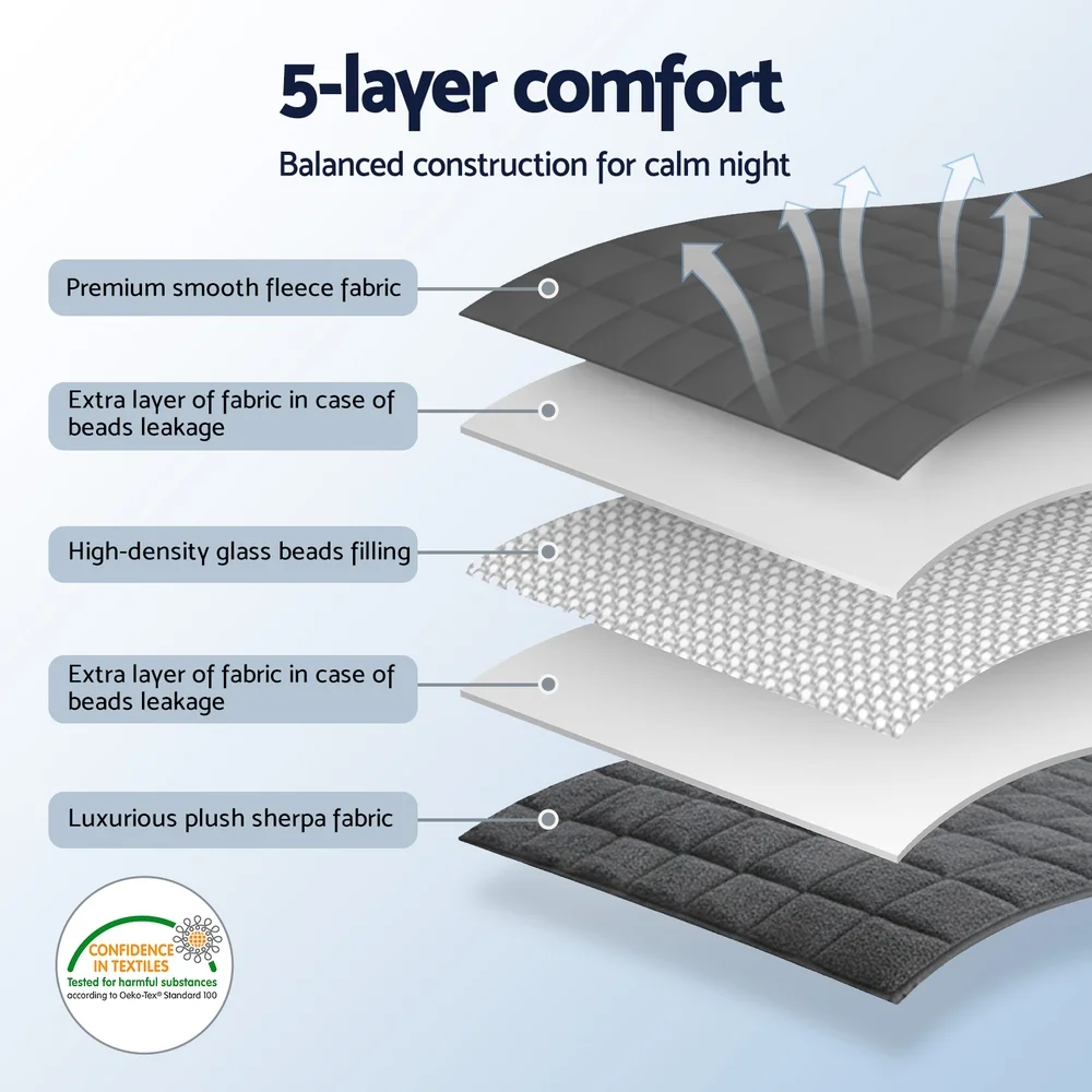 Wrap yourself in comfort with the Giselle Bedding Weighted Blanket, designed with dual-sided fleece and sherpa fabrics for softness and versatility. Its innovative 5-layer structure secures high-density glass beads within durable stitching, ensuring even distribution and long-term use. The blanket naturally conforms to your body, providing consistent coverage for a cosy and relaxing rest. Finished with reinforced stitching and four-band edges, it prevents leakage while maintaining a neat appearance. Perfect for use on the bed, sofa, or during downtime, this versatile blanket combines premium materials with thoughtful design to elevate your everyday comfort.
