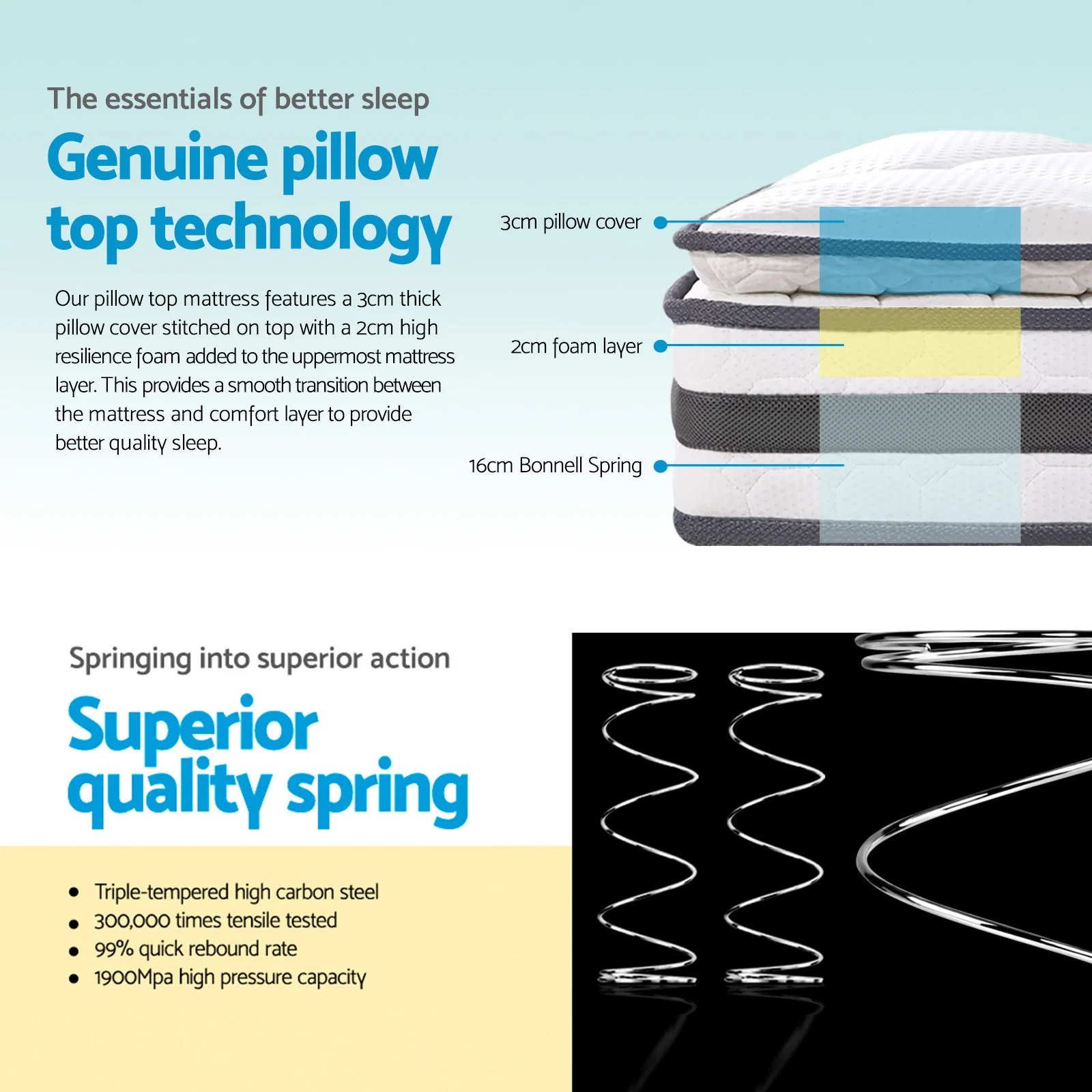 Studies have shown that Australian like their mattress medium firm and we have done so with this Pillow Top Mattress. Giving you a perfect balance of comfort and support and waking up refreshed and rejuvenated for the day. Better still, the cycle repeats itself for many more years of restful bliss. Get yours today.