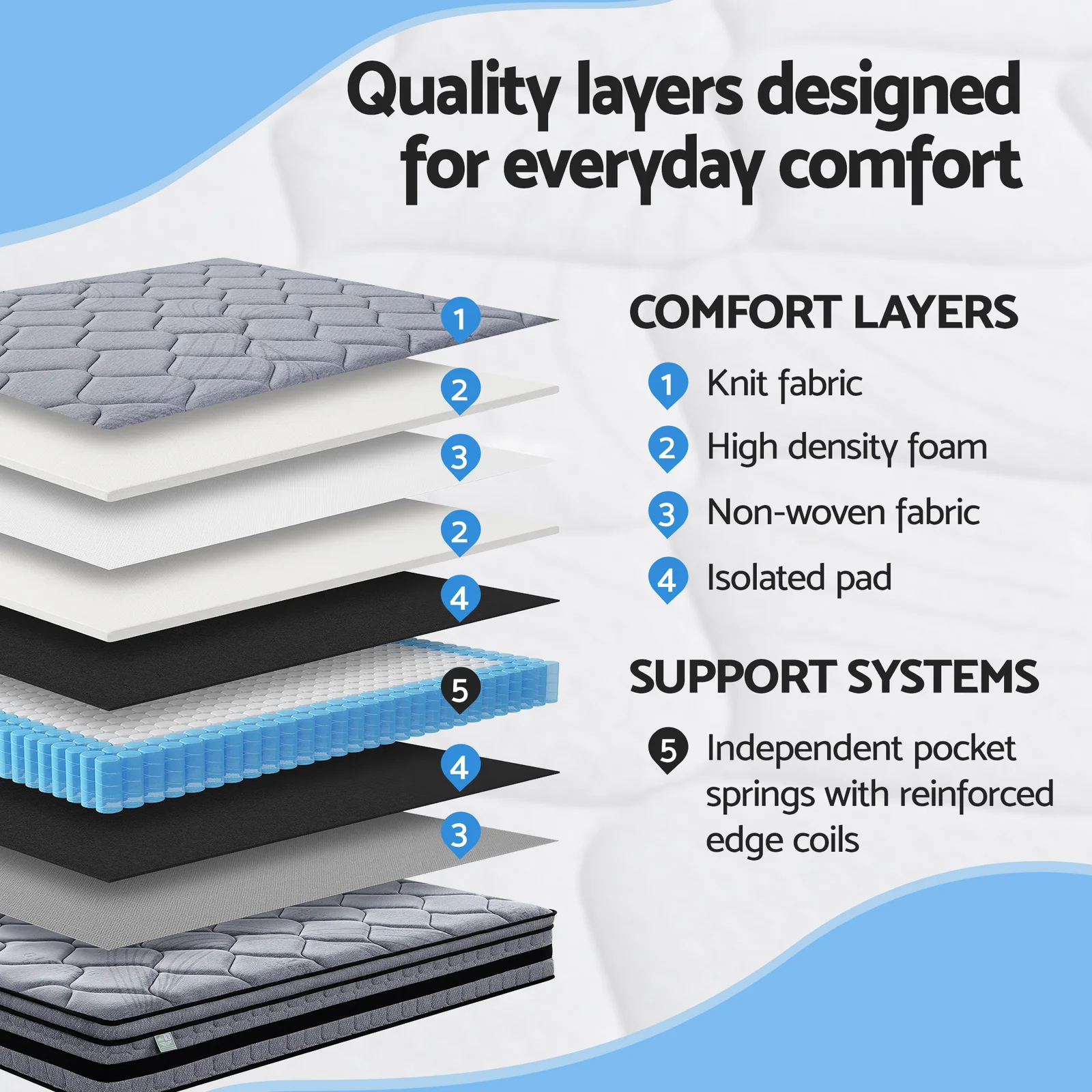 Upgrade your daily rest with the Giselle Bedding TITAN Series 34cm Hybrid Mattress. Designed to blend seamlessly into modern bedrooms and apartments, this mattress is engineered for those who seek stable support and pressure relief. At the core is a sophisticated pocket spring system featuring 1.8mm individual coils for motion isolation, bordered by 2.15mm reinforced springs to ensure firm edge-to-edge support.