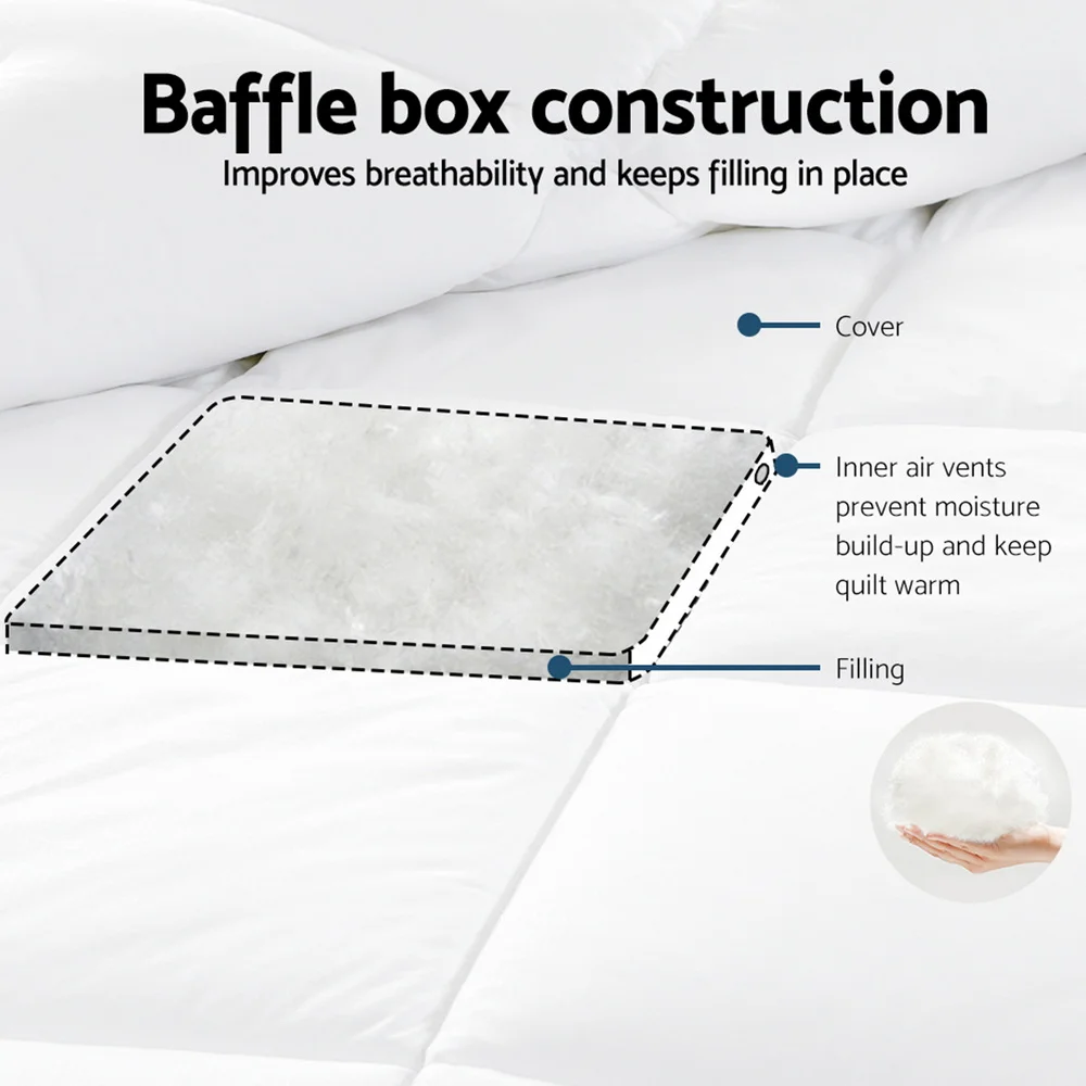 Indulge in luxury comfort with our finely constructed Giselle Bedding Goose Down Feather Quilt. It is the perfect quilt to provide you with seasonal comfort and a great feeling at all times. Filled with goose down feathers with 800gsm weight, the quilt embodies a baffle construction that prevents shifting of the filling and helps to expand the down to retain heat, providing optimal warmth. The goose down feathers are lightweight and provide true warmth without added weight. Plus, the quilt is mite and mould-resistant and easy to maintain. Not least, the cover itself is 100% pure cotton with a 233 thread count for exceptional quality.
