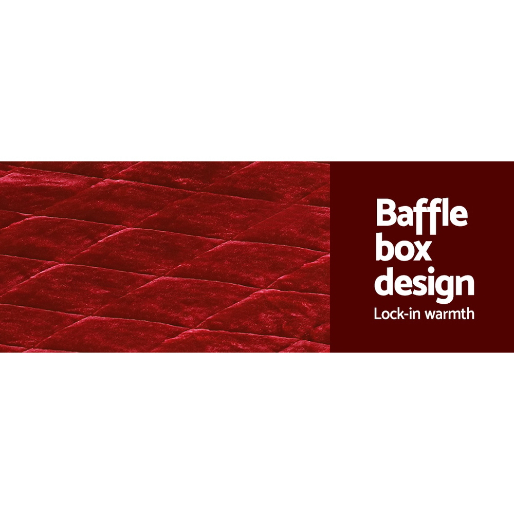 Experience exquisite luxury and warmth with the Giselle Bedding Faux Mink Quilt. With its high-density 300gsm polyester filling and 200gsm cover, the doubled-sided quilt is soft to the touch and well-padded for comfort. Its baffle box design ensures a premium feel and no leakages with its meticulous needlework. The quilt is also thermo-regulating to provide warmth always and its winter weight makes it a perfect choice for those windy days and chilly nights. Plus, the silvery sheen brings out the chic factor of this wonderful faux mink quilt that transforms an ordinary bed to an elegant one. Better still, the quilt also comes with matching pillowcases to complete the lovely set. Not least, the quilt and pillowcases are machine washable and suitable for myriad uses where a warm and cosy experience is much appreciated. Features Double-sided faux mink fur quilt High-density polyester fabric Winter weight Soft texture Baffle box design Nice and secure stitching Leakage prevention Thermo-regulating Close-fitting to body shape Silvery sheen Machine washable Versatile use Suitable for use on couch, in bed and during camping Vacuum-packed Bonus matching pillowcases Specifications: Brand: Giselle Bedding Total weight: 500gsm Cover: 200gsm polyester Filling: 300gsm polyester Colour: Burgundy Size: Super King: 270cm x 240cm Pillowcase: 74cm x 52cm (Standard size) Package Content 1 x Giselle Bedding Faux Mink Quilt 2 x Pillowcase 1 x Storage Bag