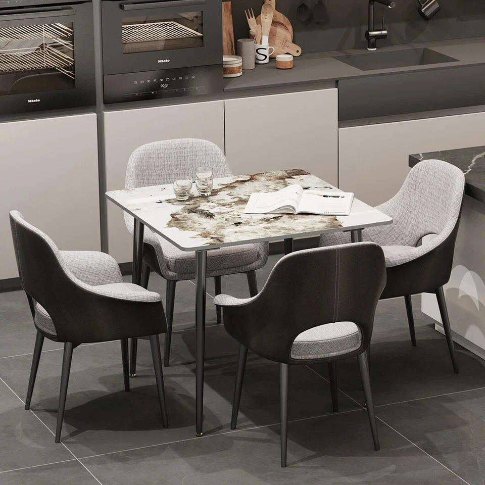 Black metal legs decorates the sintered stone tabletop for a sophisticated touch.