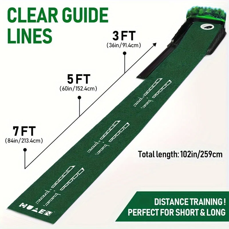 Sharpen your golf skills anytime with the Golf Accelerator Putting Mat. Designed for convenience, it features an automatic ball return system and a behind-the-hole collector to keep your training smooth and uninterrupted. With clear visual guides of 3cm, 5cm, and 213.36cm, you can measure and improve your precision over time. Durable polyester fabric and a sturdy polystyrene base ensure lasting performance. Refer to the image for detailed product dimensions. Suitable for indoor and outdoor use, this putting mat is made for golfers of all levels.