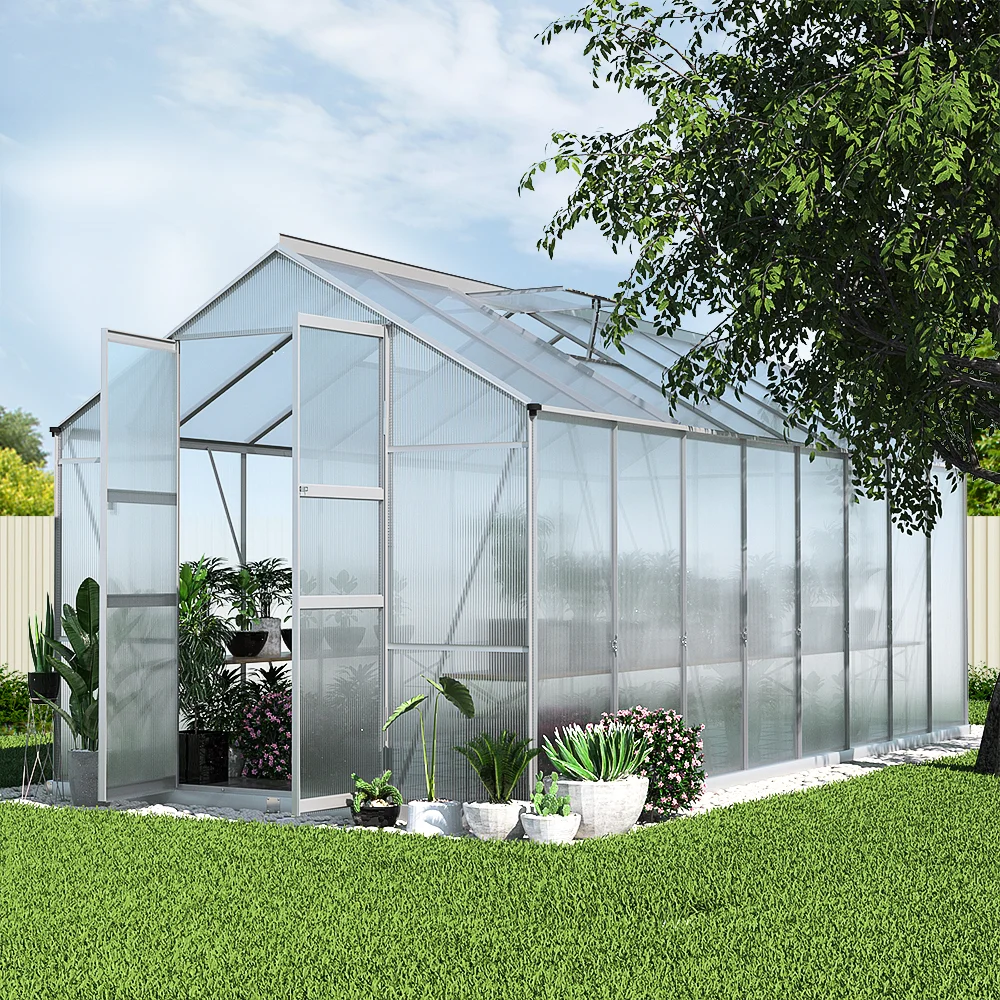 With a spacious 26.56m volume, it accommodates many plants and vegetables. The twin-wall UV-resistant polycarbonate panels allow 90% light transmission while reducing plant burn risk.