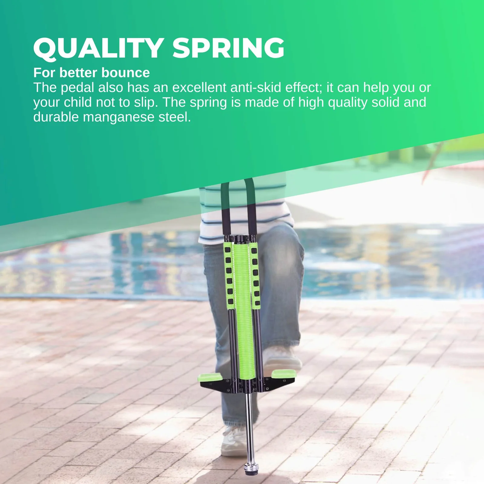The shafts of these jackhammer pogo jumpers are made of solid durable iron alloy. Handlebar grip is made of anti skid ABS material protection cover. The pedal also has an excellent anti-skid effect; it can help you or your child not to slip. The spring is made of high quality solid and durable manganese steel.