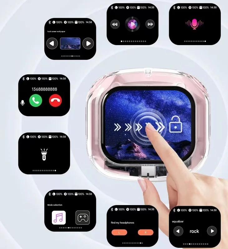 - Revolutionary LCD Touchscreen Case: The charging case features a vibrant smart touchscreen, allowing you to answer calls, control music playback, select EQ modes, find your earbuds, set wallpapers, and even use it as a flashlight, all from the case itself.