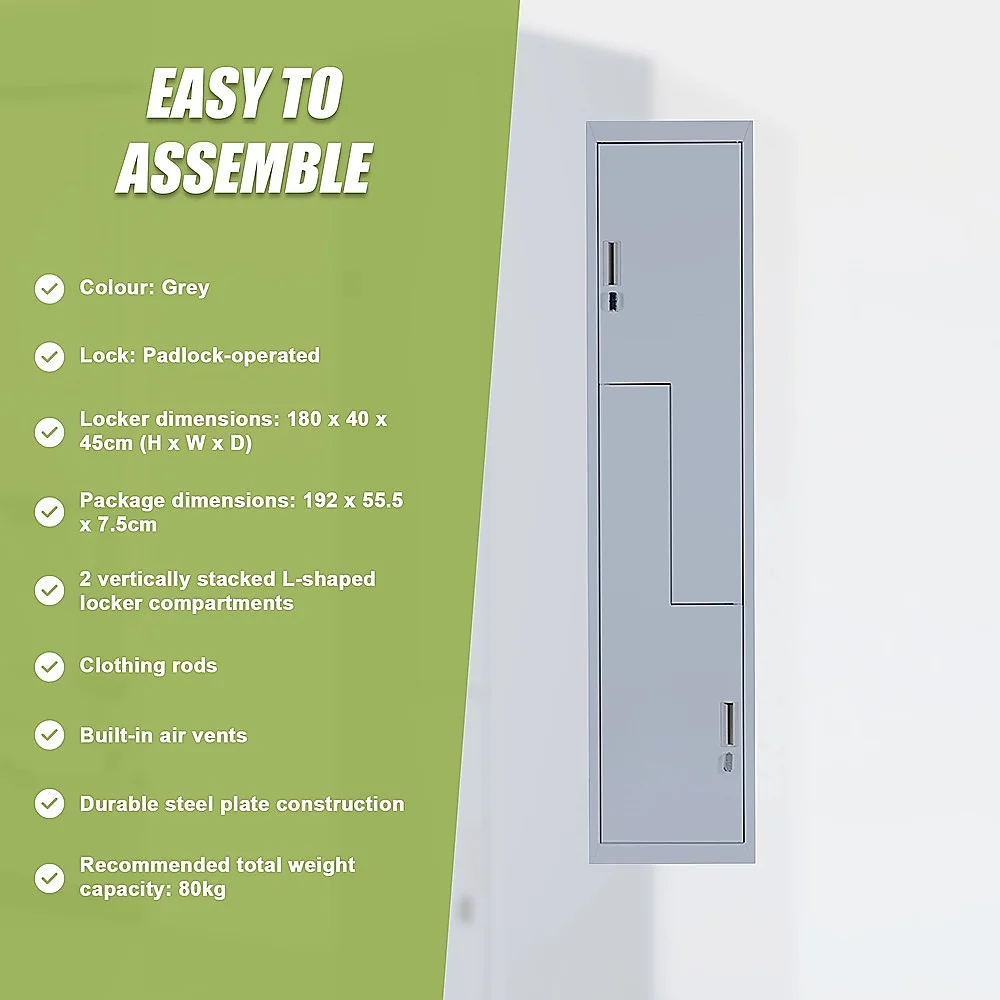 The locker measures 180 x 40 x 45cm and is constructed with steel plates for strength and durability.