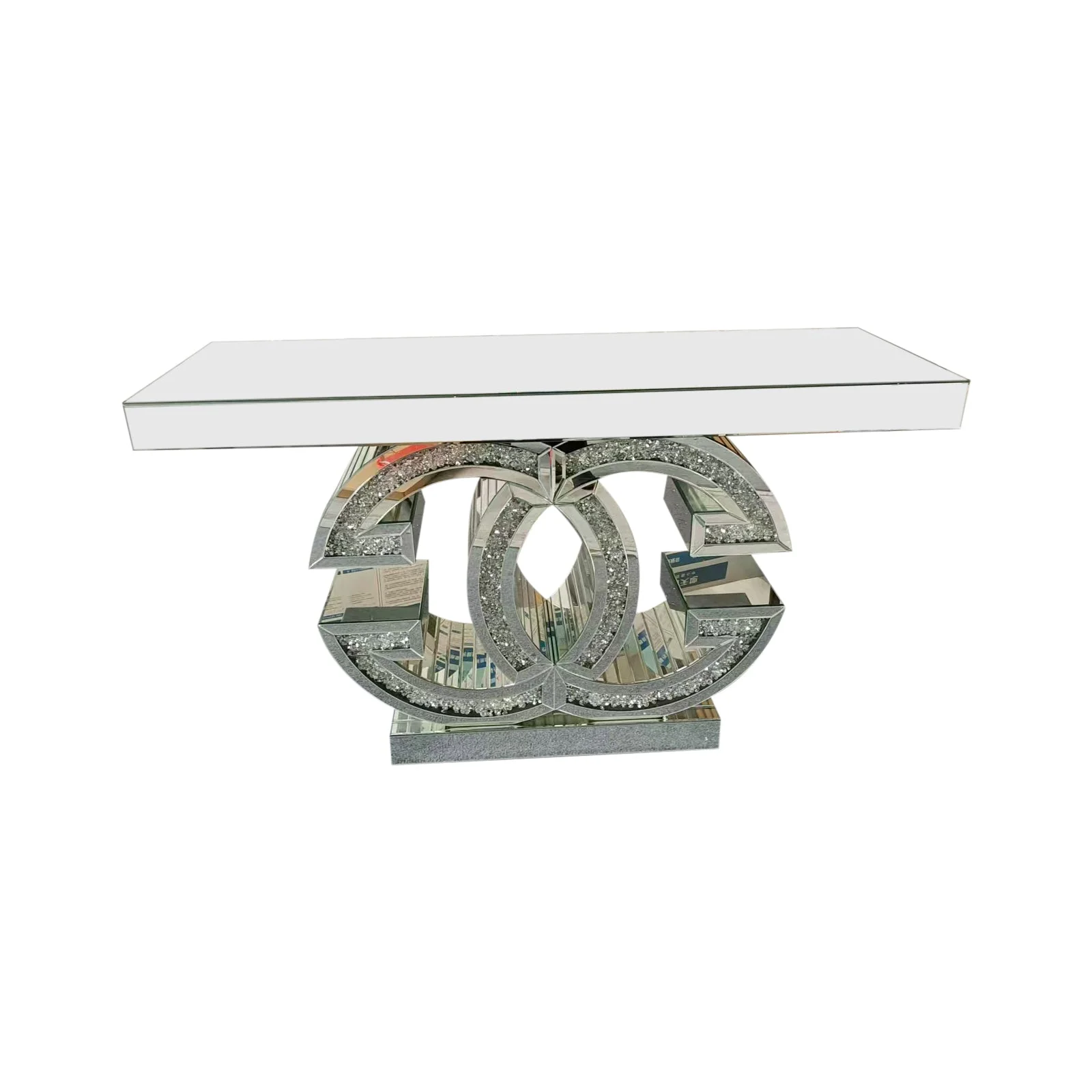 This beautiful table has a gorgeous base with crushed Acrylic diamond adornment. Underneath the table top, there is a shiny ring shaped design which overlaps with each-other beautifully. This aesthetic piece of furniture is sure to draw attention.