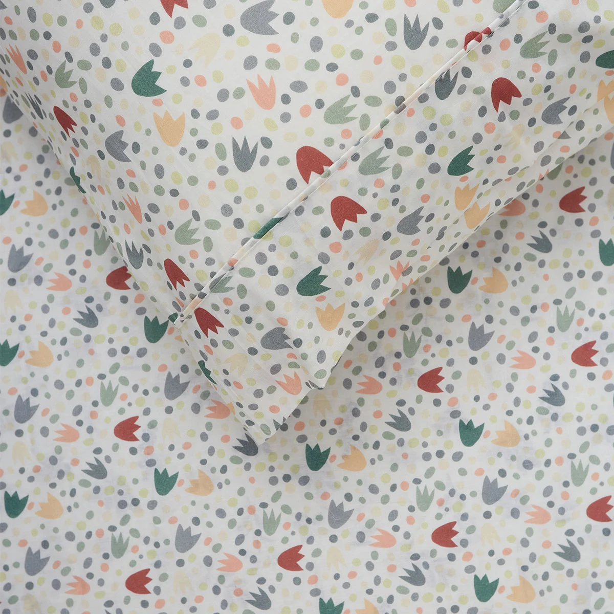 The Dino Mania Green Cotton Sheet Set by Happy Kids adds a fun and playful touch to your child's bedroom. Featuring a lively dino-themed print with a mix of earthy and vibrant tones of green, white, yellow, red, blue, and grey, this set sparks imagination while providing a cosy sleep space. Made from soft, breathable cotton, it offers a comfortable and restful night. Perfect for little adventurers who love dinosaurs!