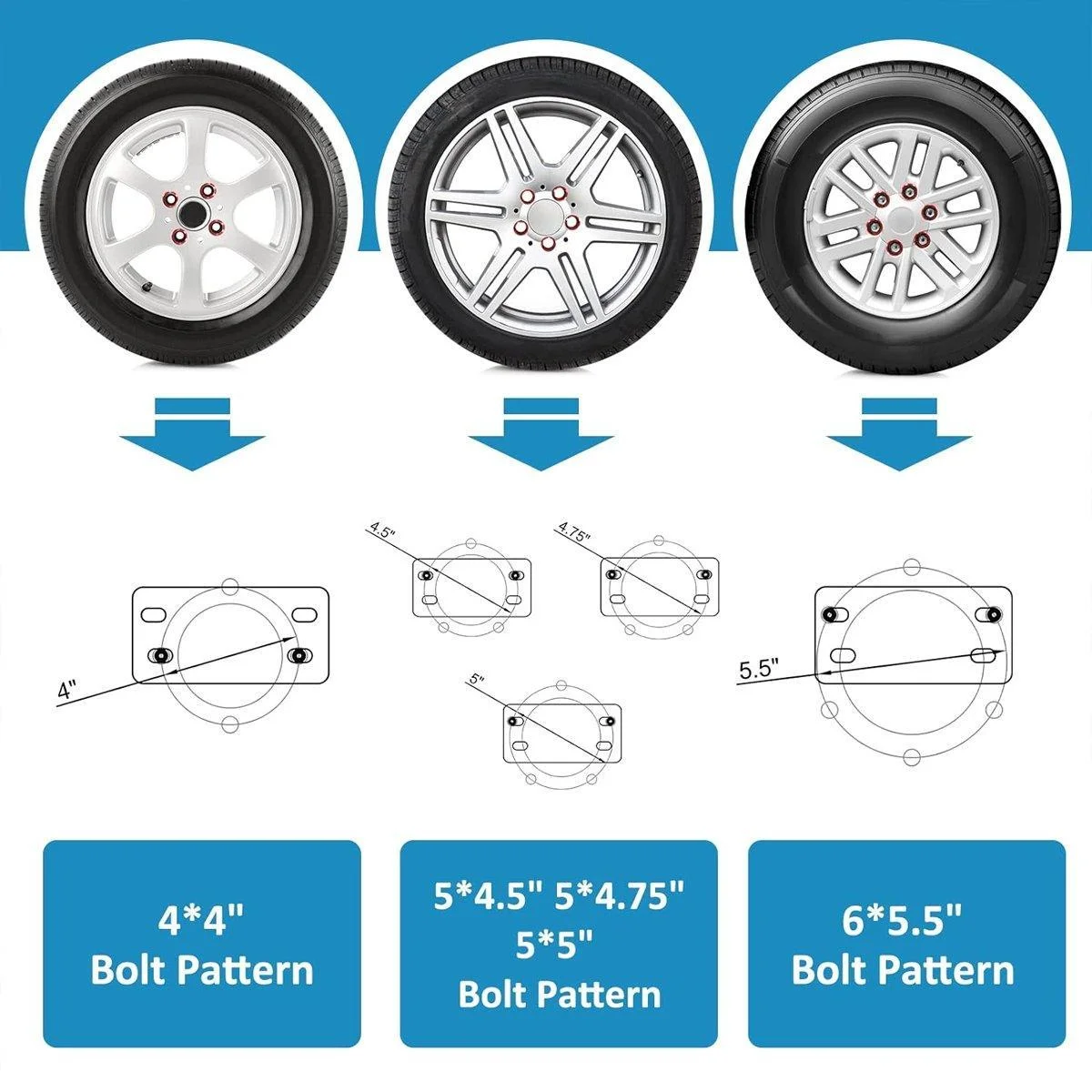 Compatibility: Suitable for most trailer types with 4" x 4", 5" x 4.5", 5" x 4.75", 5" x 5", and 6" x 5.5" bolt patterns