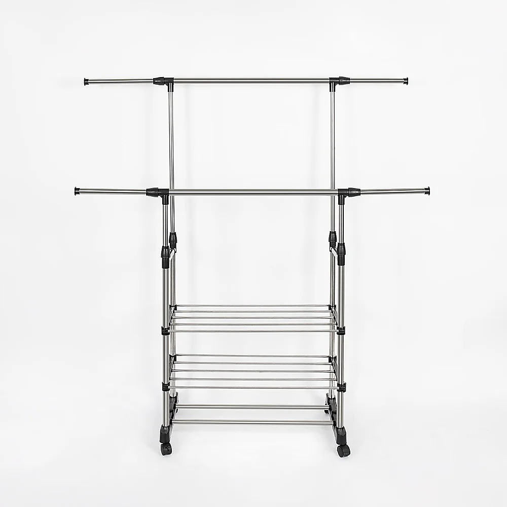 Designed for various settings, it is ideal for laundry rooms, bedrooms, and even as a display in stores or markets. The double bar feature allows you to accommodate a larger amount of clothing, while the two-layer rack provides space for shoes and shoe boxes.
