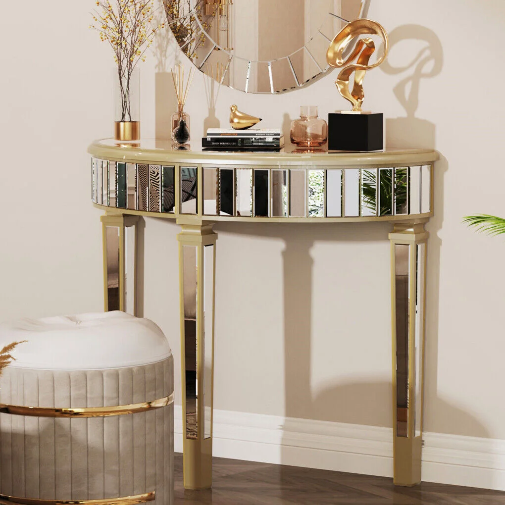 Luxury Console Table The polished high-deition glass becomes a bright mirror inlaid on the table legs, tabletop, and table sides, the edges are smooth and not sharp, making the entire console table exude a luxurious and elegant atmosphere, half round hallway table, the perfect addition to your living room, bedroom, hallway, or any other occasion you desire