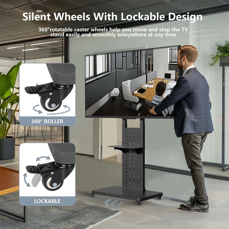 Heavy Duty Mobile TV Stand with Wheels This item stands out for the following characteristics: Versatile Viewing Angles: Rotate your TV vertically and adjust the height to suit your viewing preferences, perfect for both home and commercial settings. Sturdy and Durable Construction: Made from high-quality cold rolled steel, this stand supports TVs up to 65 inches and 50 kg, ensuring stability and longevity. Easy Mobility: Equipped with smooth-rolling wheels, this TV stand can be moved effortlessly between rooms or different areas of your office or home. Precision Leveling: Includes a built-in bubble level for precise alignment and easy installation, ensuring your TV is perfectly positioned for optimal viewing. Key features: Item weight: 19.25 kg. Package weight: 19.25 kg. The box includes the product and all its components and a simple instruction set. One product for package.